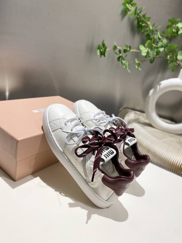 出厂 缪缪2025春夏新款 休闲小白鞋上新,官网主推款 简约的格板设计 级具辨识度的鞋舌 上脚阳光 青春,随意搭配 长裙 短裙 短裤 休闲系列都能穿出与众不同的风格 ,大底超轻Ip发泡底 ,内里头层牛里 .面料一比一复刻 做旧擦色工艺 码数35-39 34_40,41 不退不换