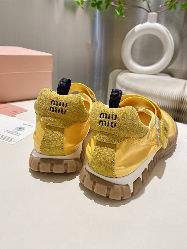 / 出厂 缪缪2025阿甘休闲鞋运动鞋 春夏新款 最近爆款前卫大胆的设计 .Miu风格融于此款厚底帆布运动鞋的简约线条 ,别致徽标饰于鞋舌与背后,点缀复古 厚底设计
