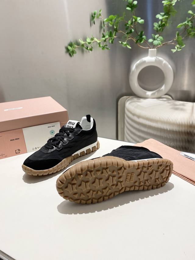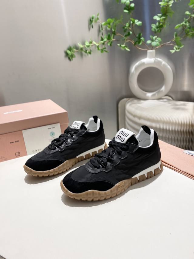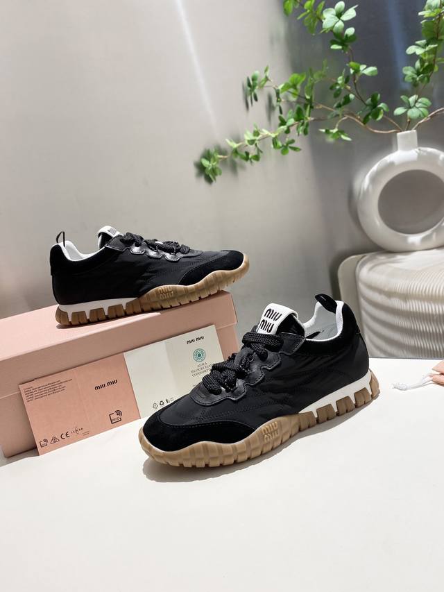 / 出厂 缪缪2025阿甘休闲鞋运动鞋 春夏新款 最近爆款前卫大胆的设计 .Miu风格融于此款厚底帆布运动鞋的简约线条 ,别致徽标饰于鞋舌与背后,点缀复古 厚底设计