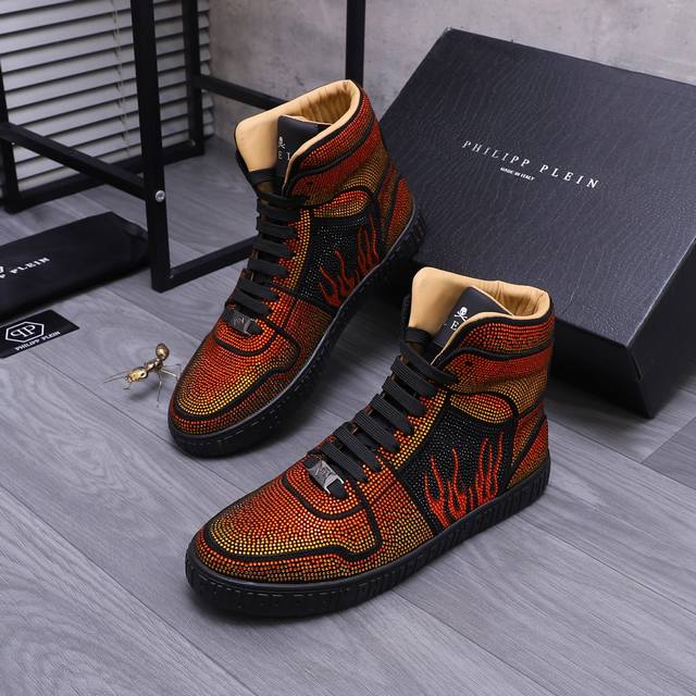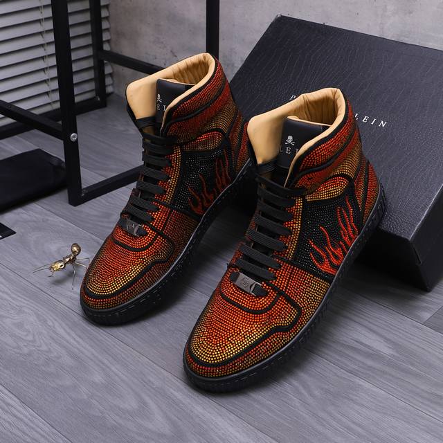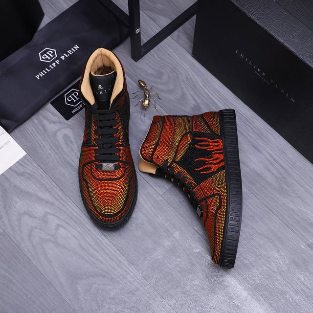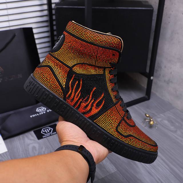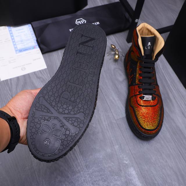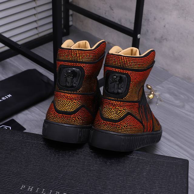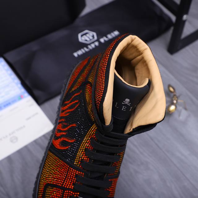 商品商标:Philipp Plein 菲利普-普莱茵 高帮休闲鞋 正码码数: 38-44 商品材料:精选 牛皮烫钻鞋面 牛皮内里 原版大底