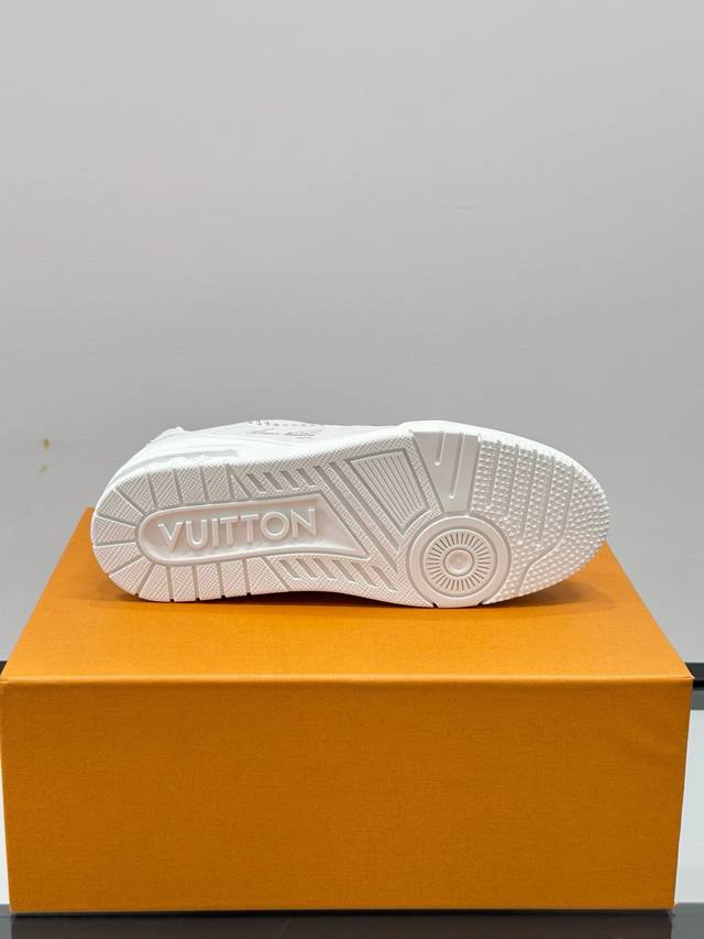 奢品 Trainer休闲运动鞋 本款运动鞋选用 Damier 粒面牛皮革,临摹 Damier 帆布的两式经典纹理,令鞋面的繁复工艺更显瞩目,创意注胶橡胶外底升级舒适体验 棋盘格设计简洁,科技橡胶外底配有创新凝胶内垫,舒适感更为出众 外底饰monogram Flowers图案 经典的篮球鞋款!