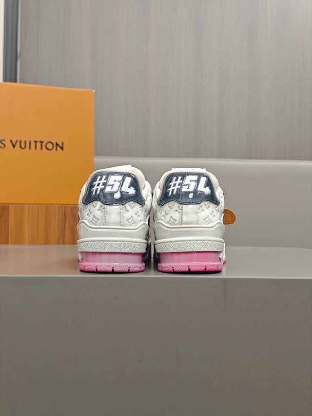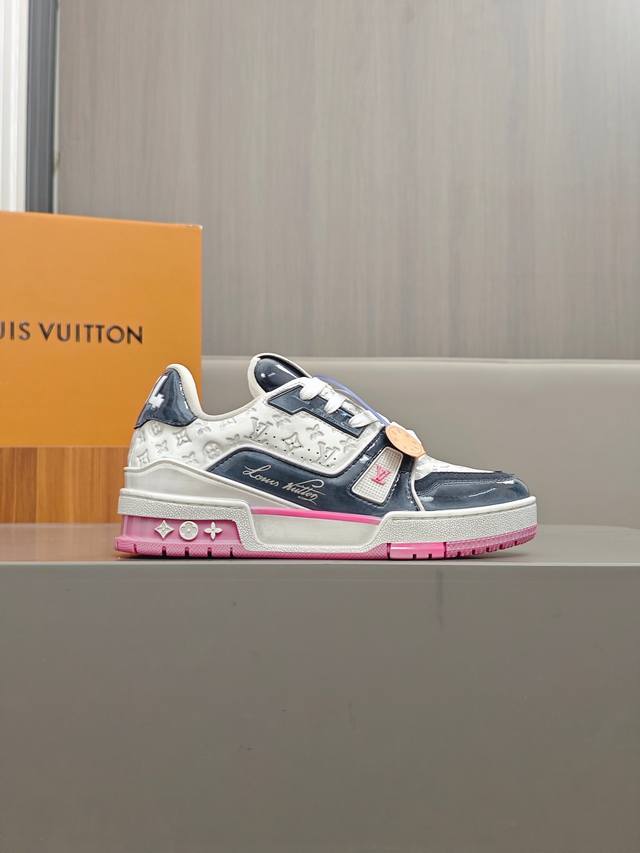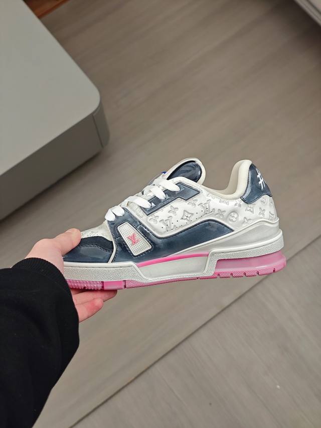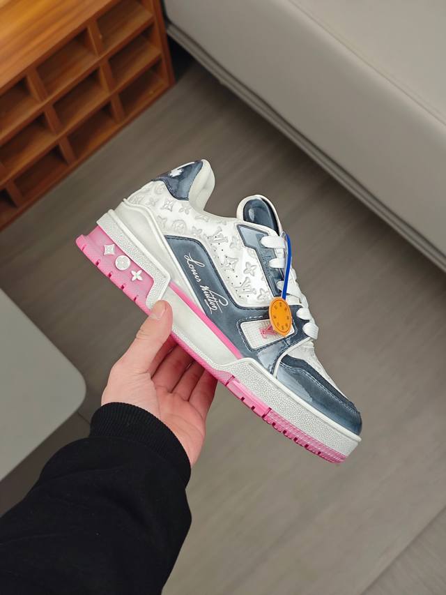 奢品trainer男士休闲运动鞋 ,运动鞋记录设计师 Virgil Abloh 由复古篮球鞋激发的经典创意,此次拼接光滑牛皮革和 Monogram 压纹粒面牛皮革,再以 Monogram 花卉点缀橡胶外底,映现一体色彩中的醒目跳跃 科技橡胶外底配有创新凝胶内垫,舒适感更为出众,经典的篮球鞋款,回头率杠杠的,搭配轻易,上脚透气舒适!
