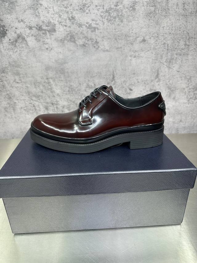 / 工厂价: 1985春最新款擦色复古乐福鞋,英伦风细带商务鞋,本厚底三角标德比鞋ken同款,大底橡胶底,面料进口开边珠,牛皮里,牛皮垫脚黑红蓝三色全套包装码数39