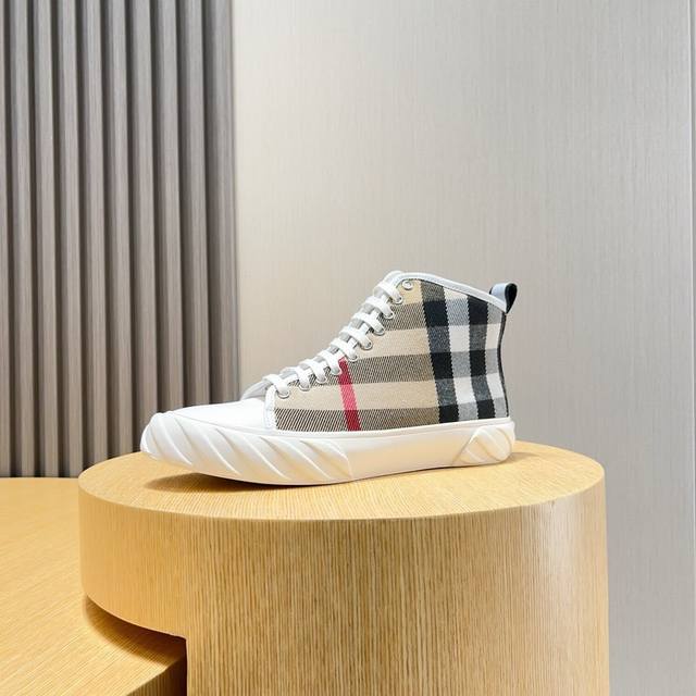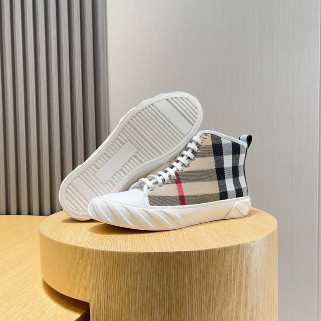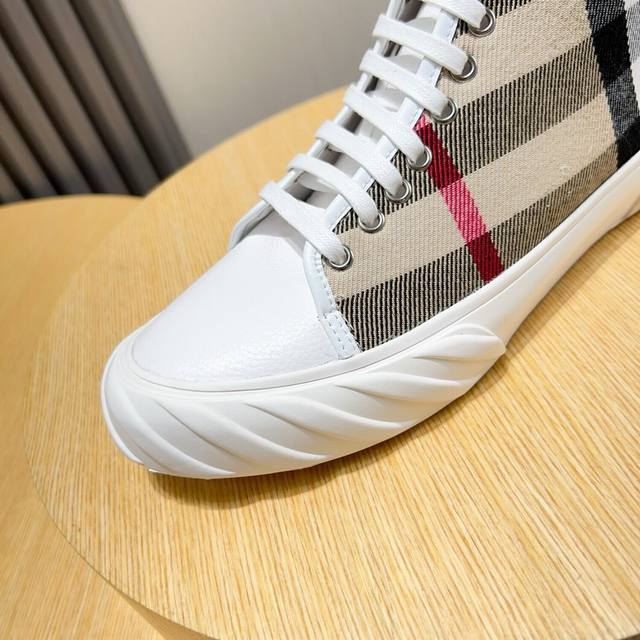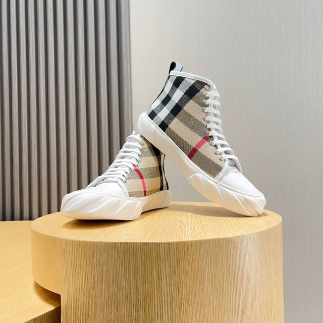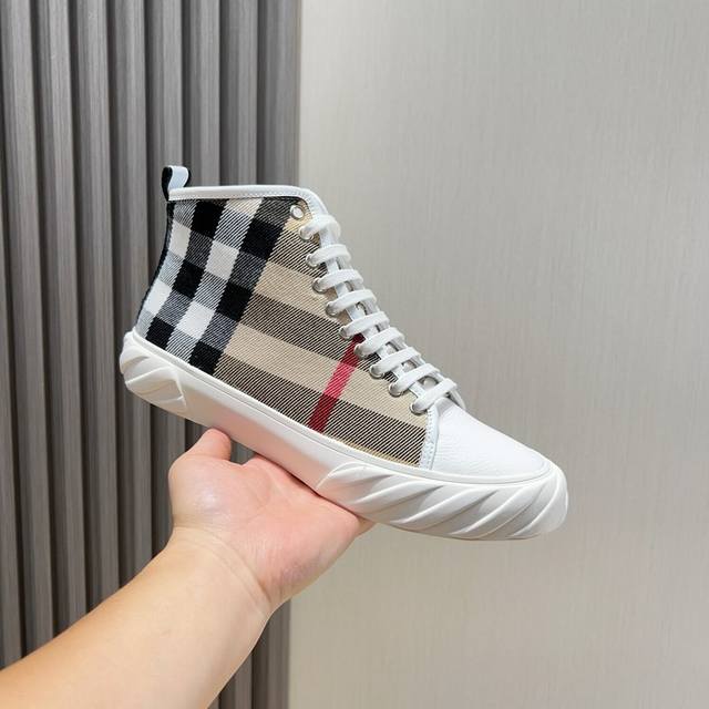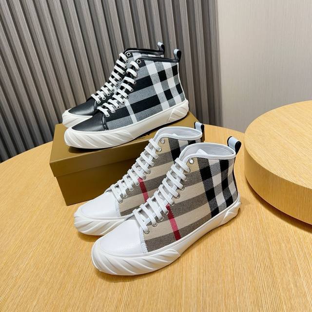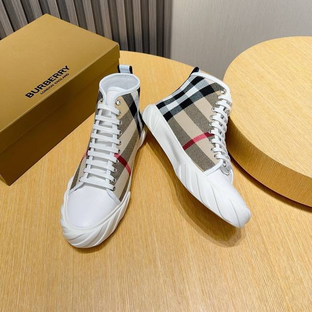 工厂价 BURBDRRY 秋季最新款高帮休闲鞋、鞋面料精选原版布料 内里选用头层羊皮 1:1原版布料复制、原版大底,精美线条、没有过多修饰,显的大方风格、上脚舒