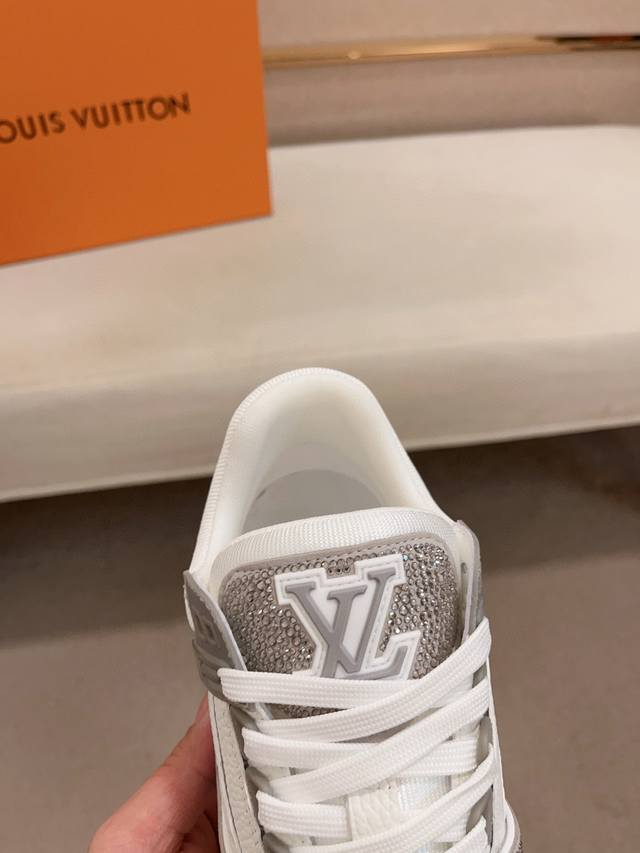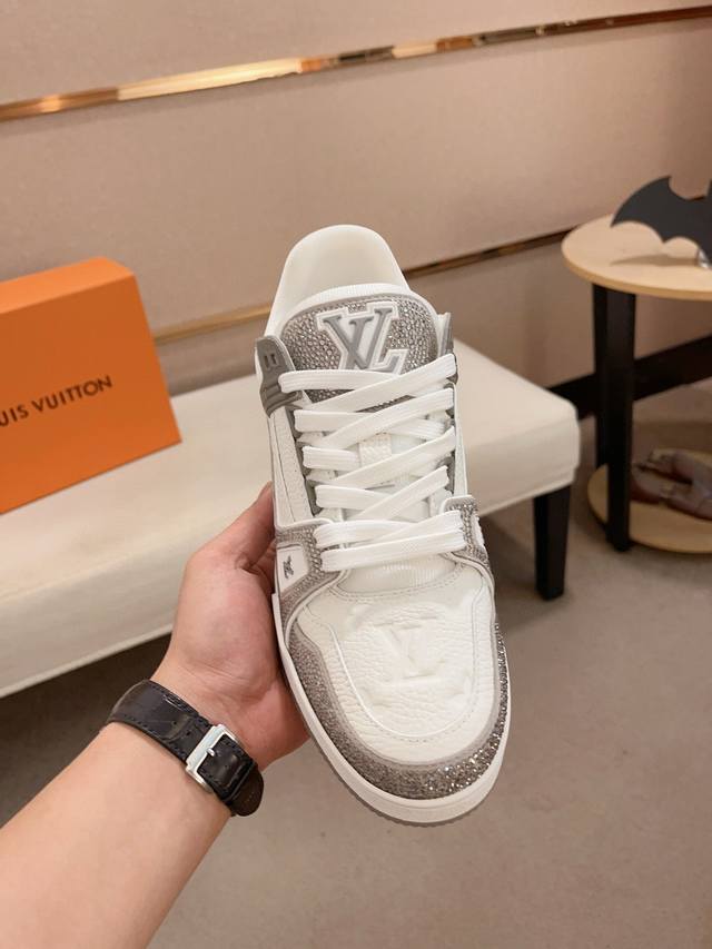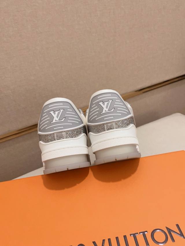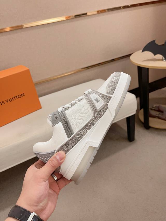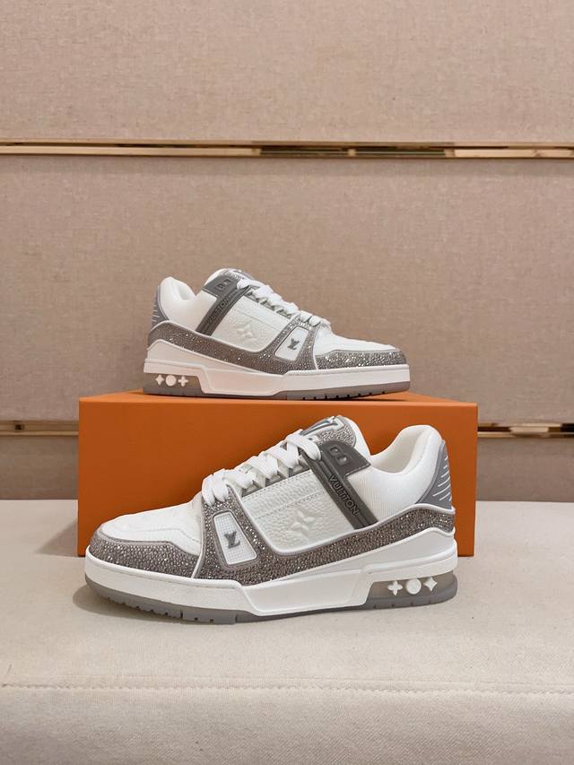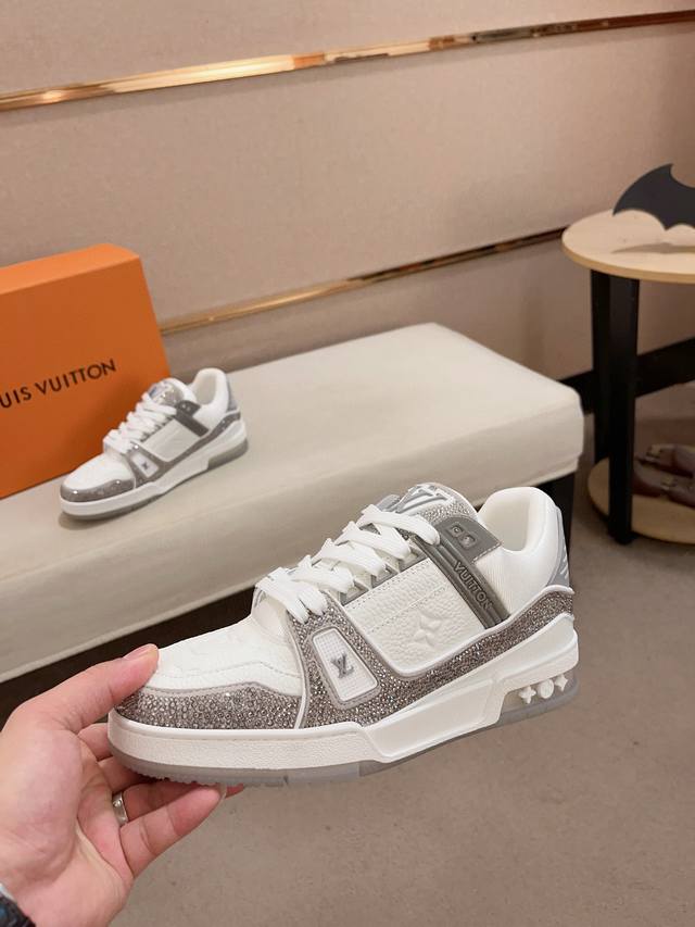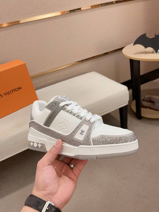 工厂价: L 奢品 Trainer情侣款运动鞋 限量烫钻版出货,进口捷克钻镶嵌鞋面闪烁耀目光芒,需七小时匠心制作方可成就经典。实物真的超闪,以男装艺术总监virgil Abloh所欣赏的复古篮球运动鞋为灵感,科技橡胶外底配有创新凝胶内垫,舒适感更为出众。外底饰有monogram Flowers图案。经典的篮球鞋款,回头率杠杠的,搭配轻易,上脚透气舒适!