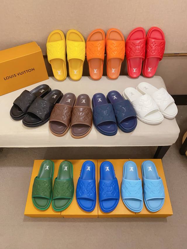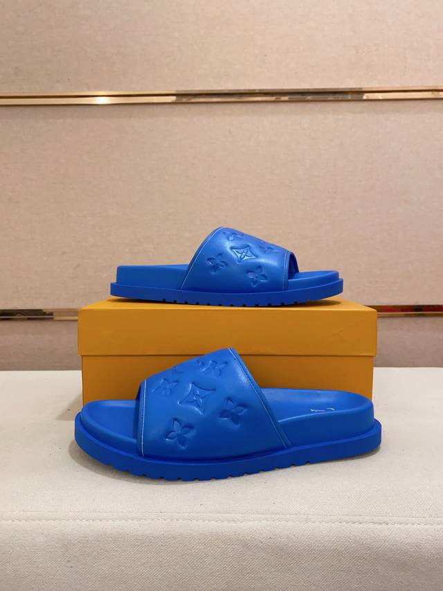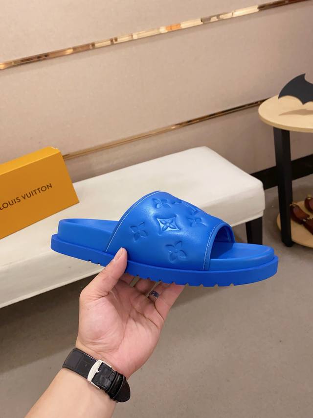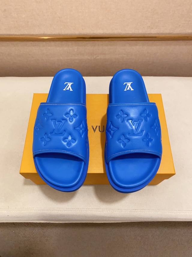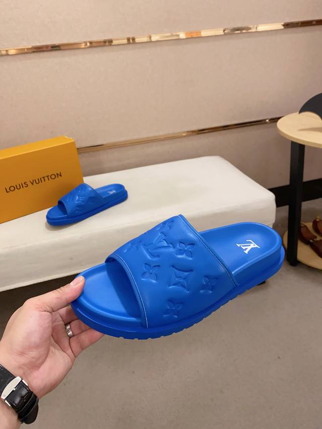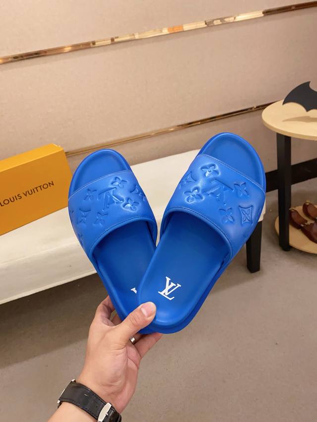 工厂价: LV打造顶级代购 男士春夏拖鞋专柜同步 鞋面意大利进口牛皮搭,标志图形高品质工艺,鞋底:原厂特供原版底,独家活动成型底超级舒适,原厂跟单货,高品质,可随意进出专柜,欢迎对比,码数38-44。