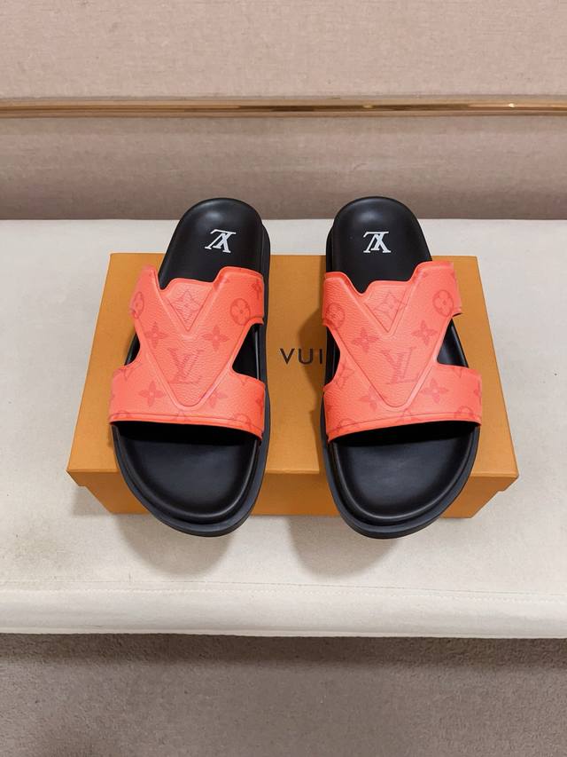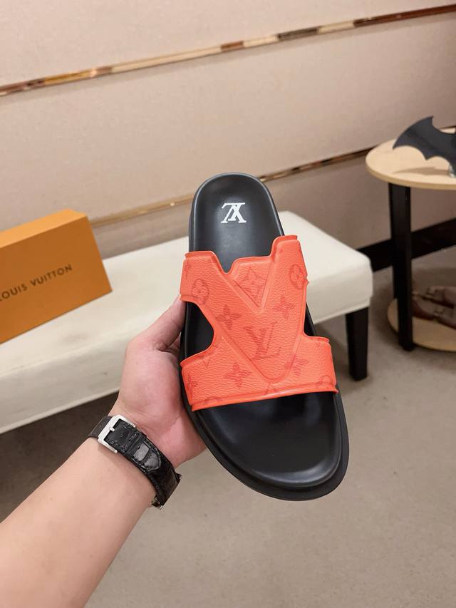 工厂价: LV打造顶级代购 男士春夏拖鞋专柜同步 鞋面意大利进口牛皮搭,标志图形高品质工艺,鞋底:原厂特供原版底,独家活动成型底超级舒适,原厂跟单货,高品质,可
