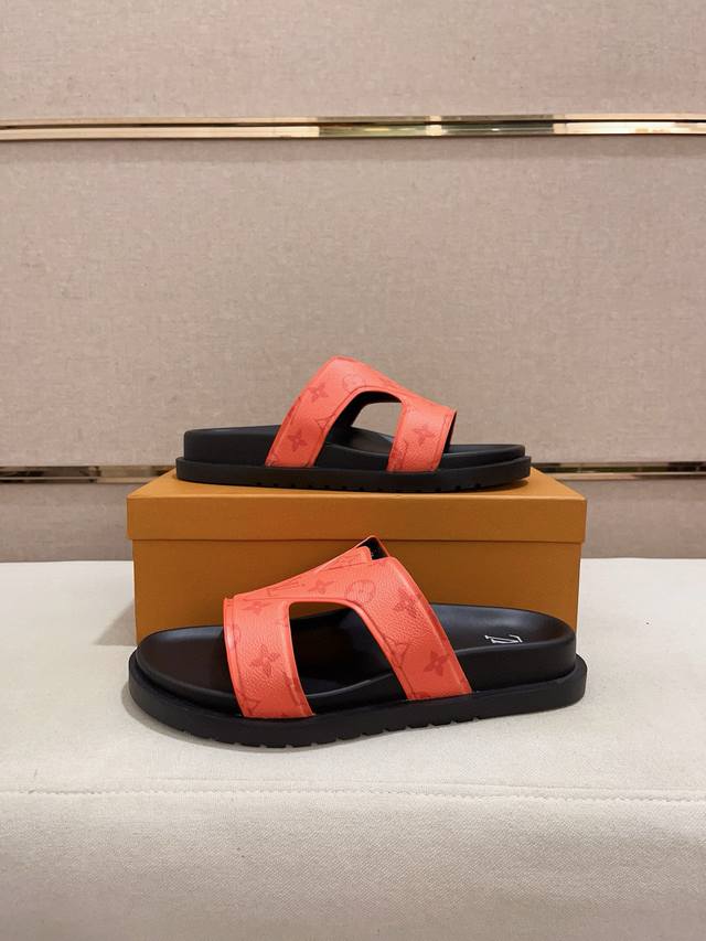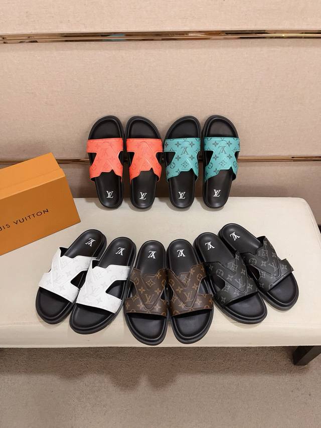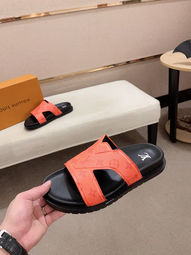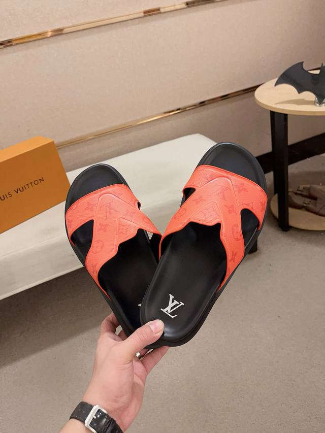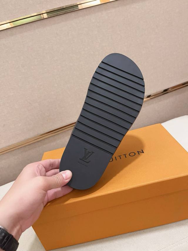 / 工厂价: LV打造顶级代购 男士春夏拖鞋专柜同步 鞋面意大利进口牛皮搭,标志图形高品质工艺,鞋底:原厂特供原版底,独家活动成型底超级舒适,原厂跟单货,高品质,可