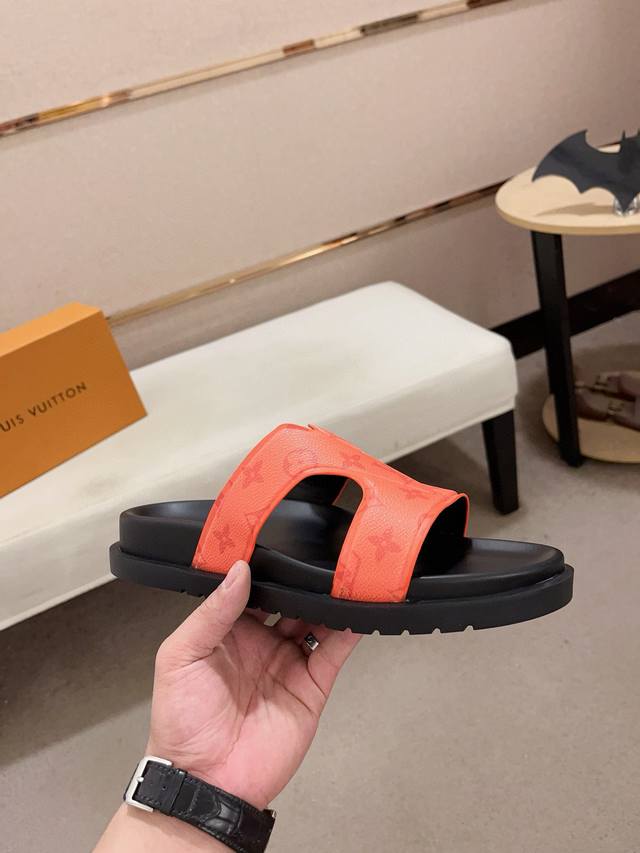 工厂价: LV打造顶级代购 男士春夏拖鞋专柜同步 鞋面意大利进口牛皮搭,标志图形高品质工艺,鞋底:原厂特供原版底,独家活动成型底超级舒适,原厂跟单货,高品质,可随意进出专柜,欢迎对比,码数38-44。
