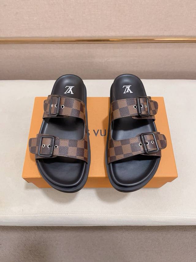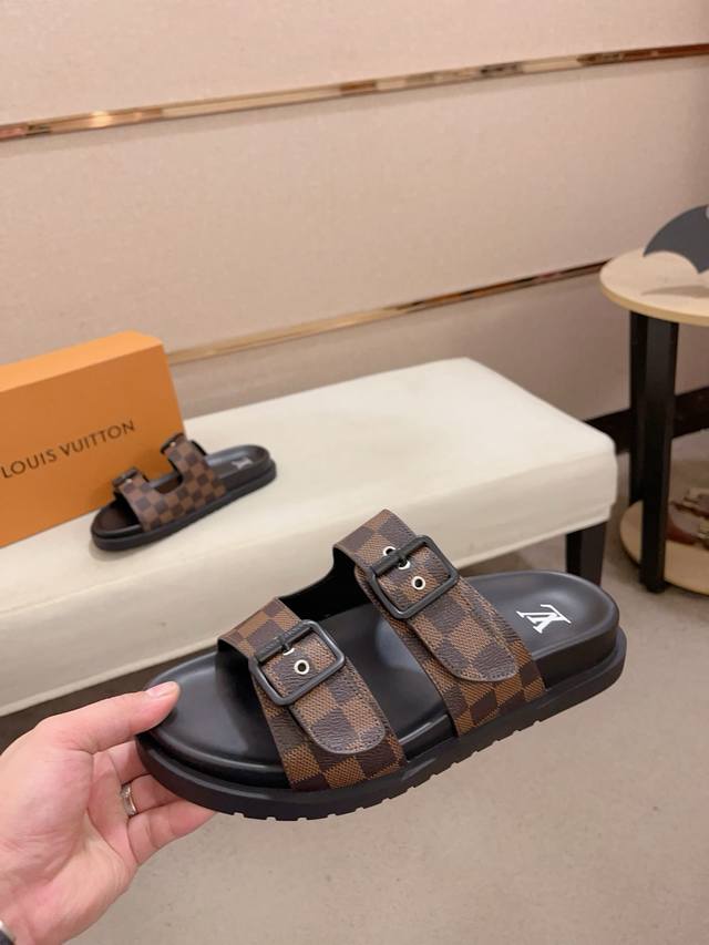 工厂价: LV打造顶级代购 男士春夏拖鞋专柜同步 鞋面意大利进口牛皮搭,标志图形高品质工艺,鞋底:原厂特供原版底,独家活动成型底超级舒适,原厂跟单货,高品质,可随意进出专柜,欢迎对比,码数38-44。