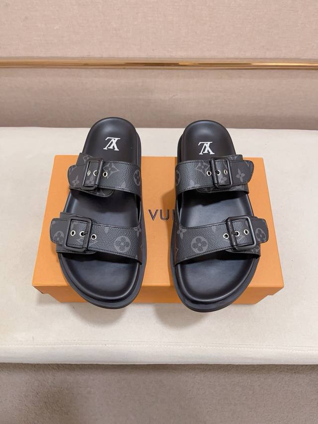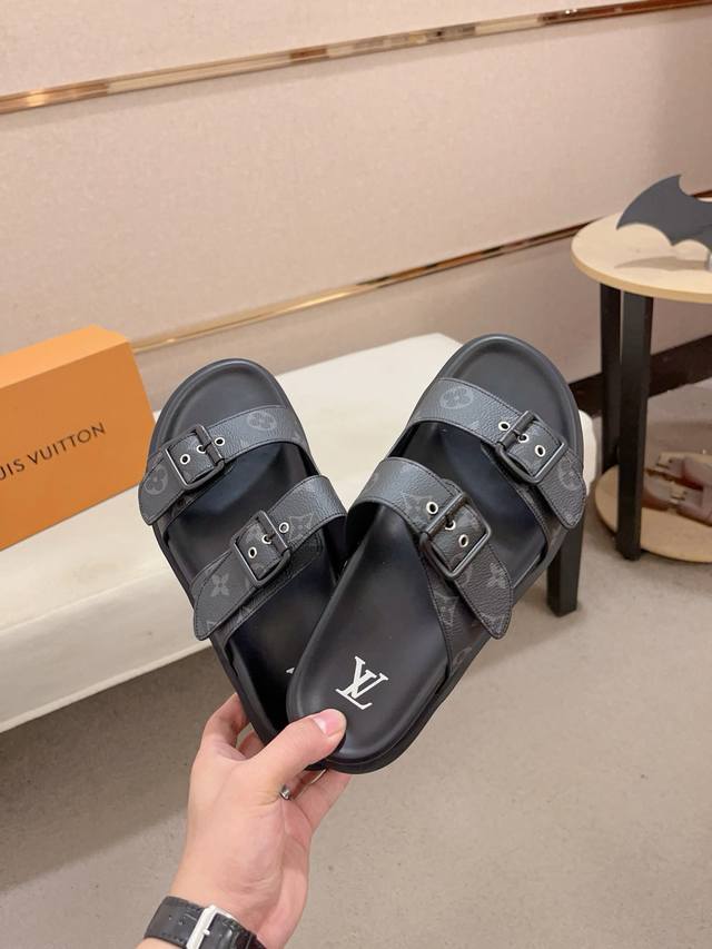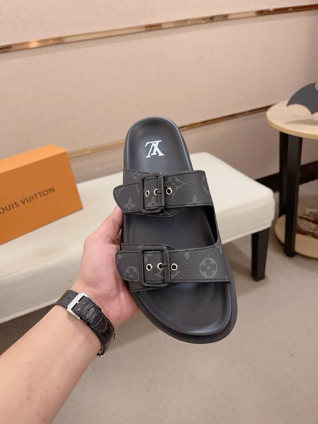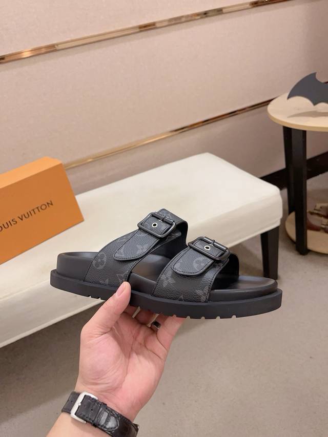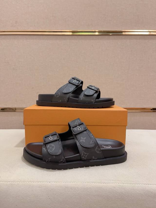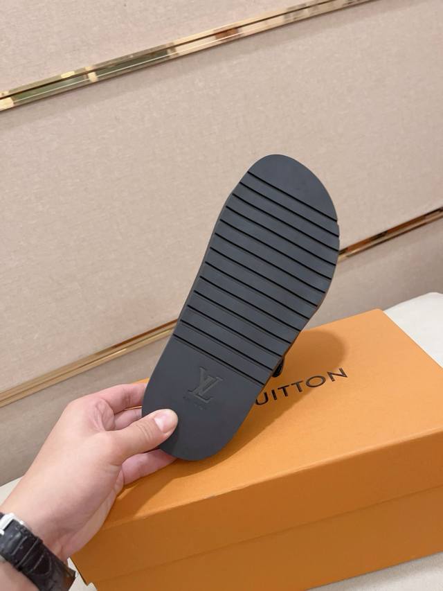 工厂价: LV打造顶级代购 男士春夏拖鞋专柜同步 鞋面意大利进口牛皮搭,标志图形高品质工艺,鞋底:原厂特供原版底,独家活动成型底超级舒适,原厂跟单货,高品质,可