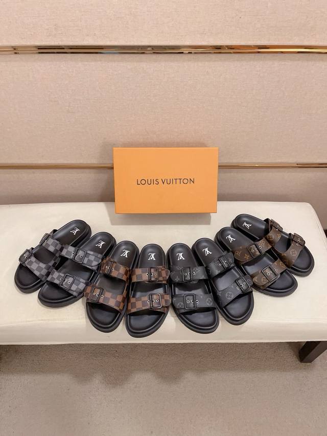 工厂价: LV打造顶级代购 男士春夏拖鞋专柜同步 鞋面意大利进口牛皮搭,标志图形高品质工艺,鞋底:原厂特供原版底,独家活动成型底超级舒适,原厂跟单货,高品质,可随意进出专柜,欢迎对比,码数38-44。