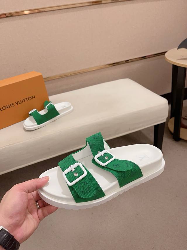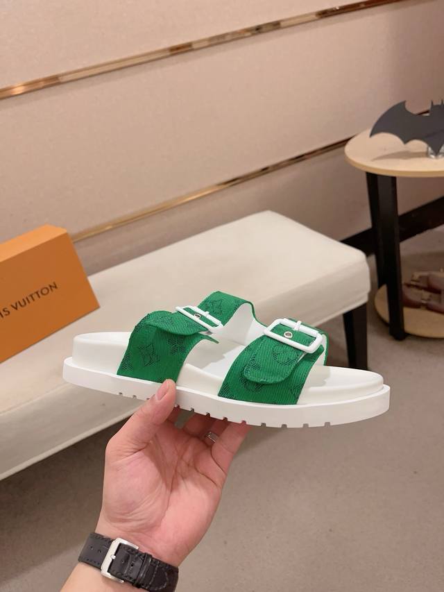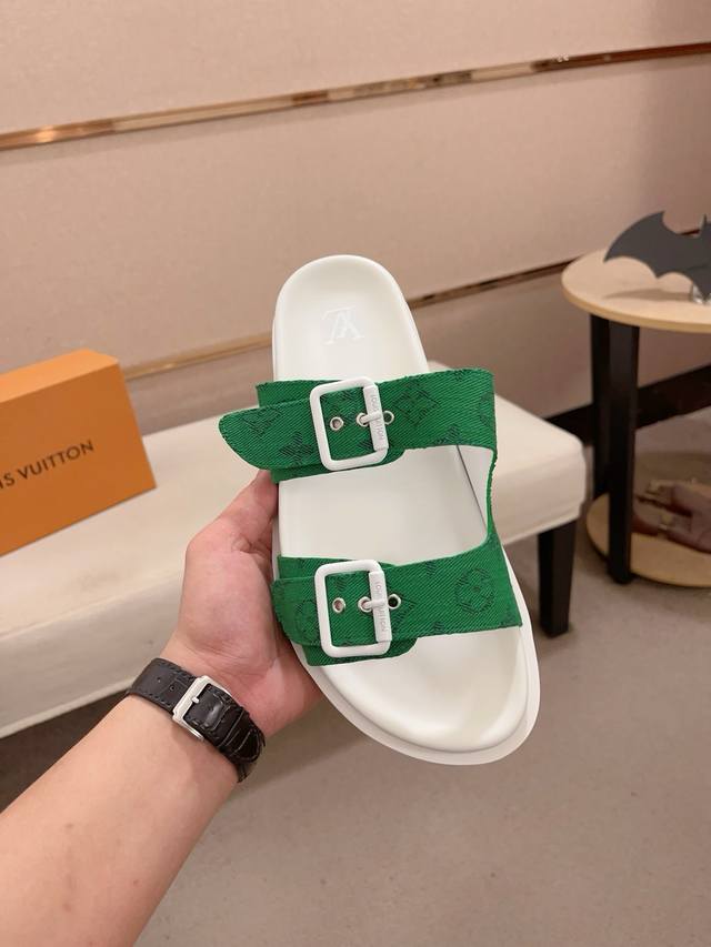 工厂价: LV打造顶级代购 男士春夏拖鞋专柜同步 鞋面意大利进口牛皮搭,标志图形高品质工艺,鞋底:原厂特供原版底,独家活动成型底超级舒适,原厂跟单货,高品质,可随意进出专柜,欢迎对比,码数38-44。