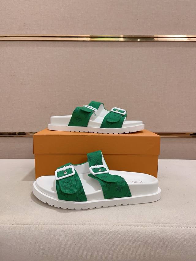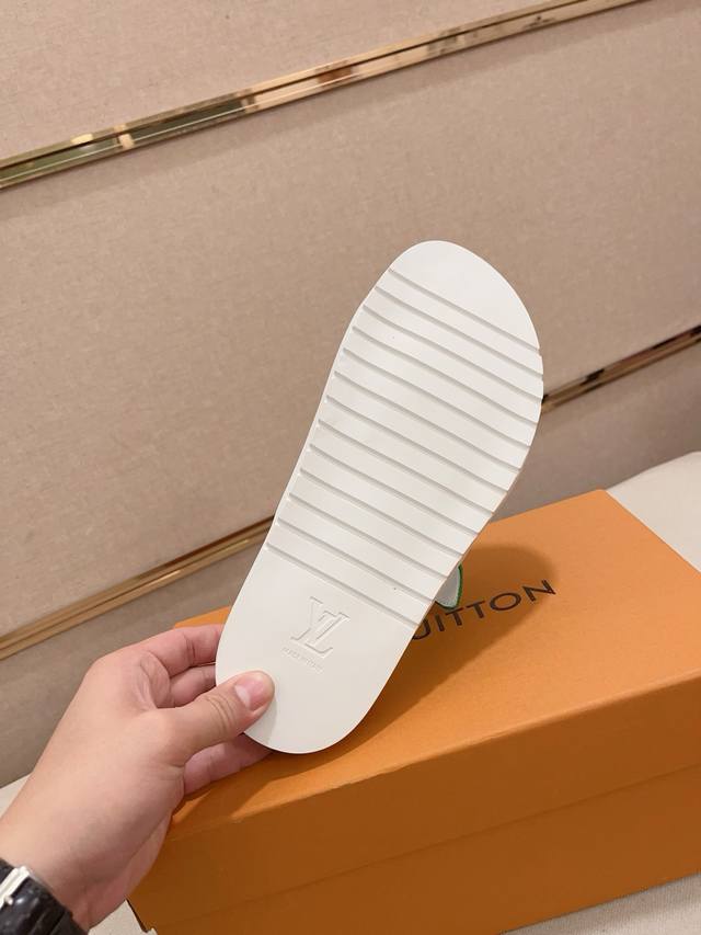 工厂价: LV打造顶级代购 男士春夏拖鞋专柜同步 鞋面意大利进口牛皮搭,标志图形高品质工艺,鞋底:原厂特供原版底,独家活动成型底超级舒适,原厂跟单货,高品质,可