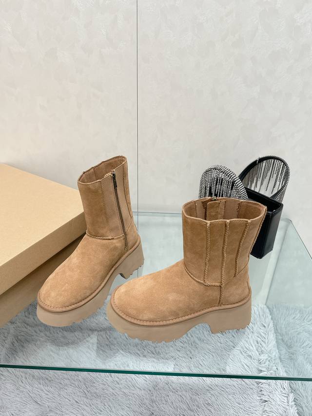鞋面采用优质牛翻毛,柔软且耐磨,呈现出自然质感的同时,确保了卓越的耐用性。内里特别升级,采用与官网同步的植入式羊毛,带来极致保暖体验,轻松应对冬日严寒。