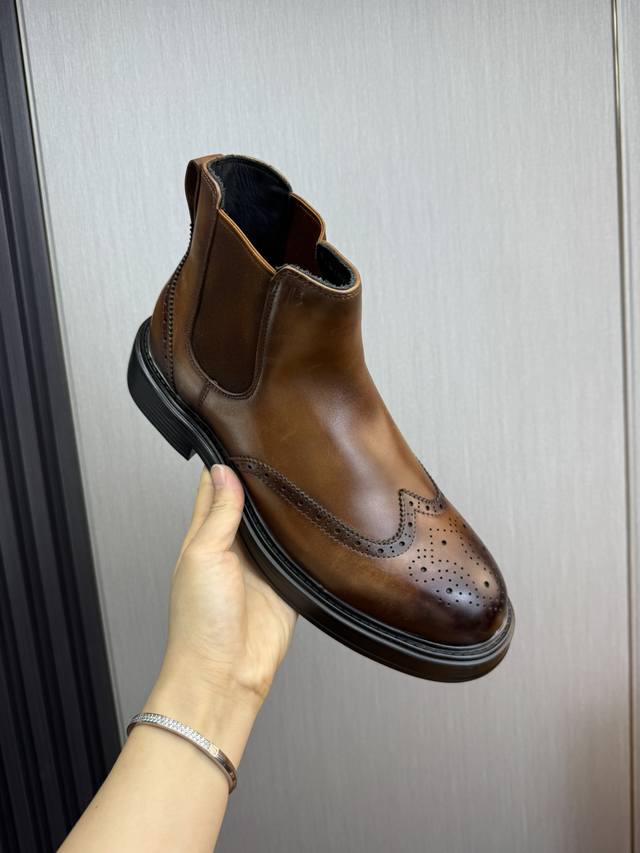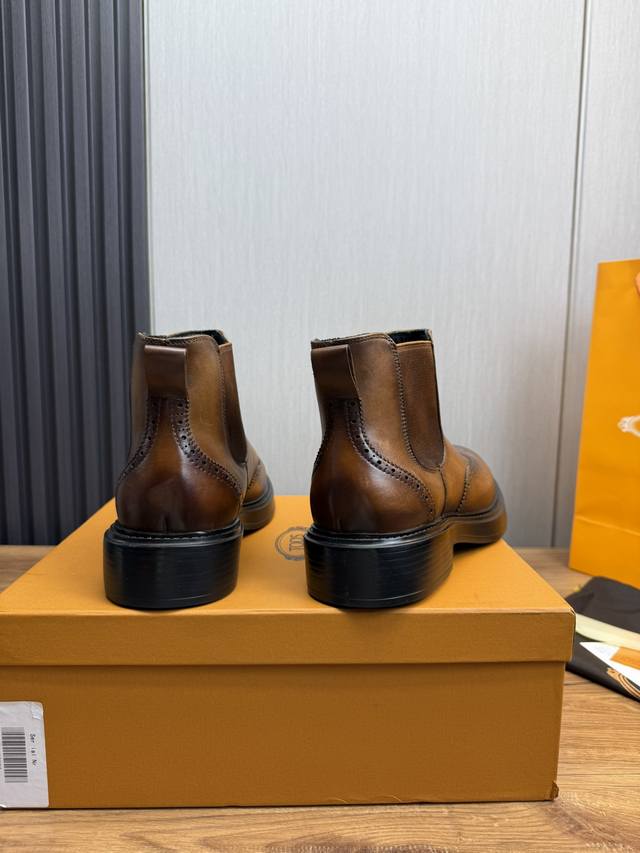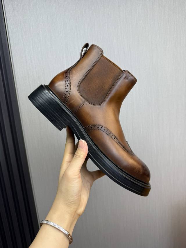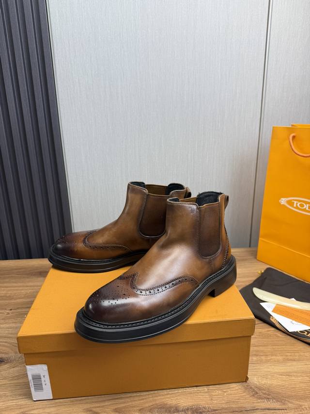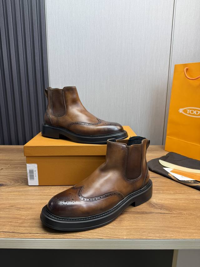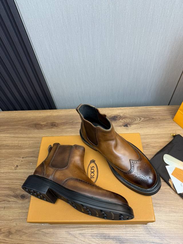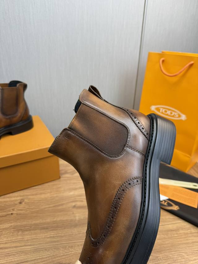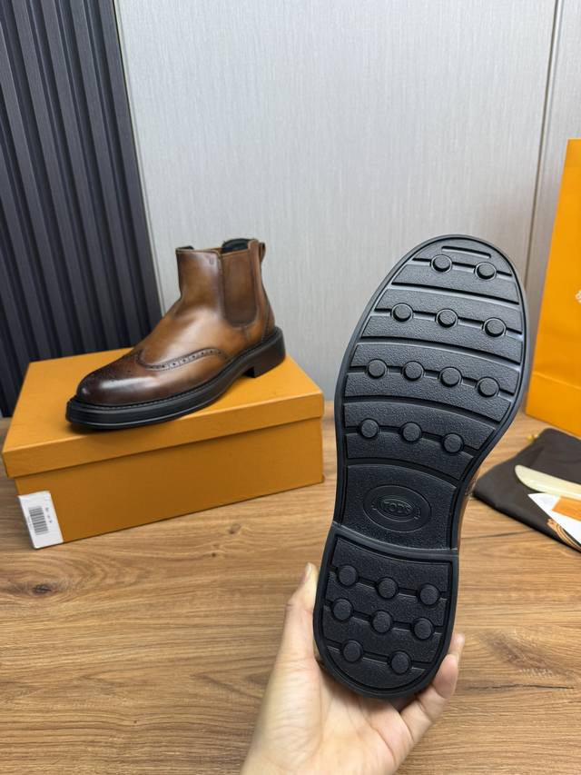 工厂价Tods.男士秋冬及踝靴,体现经典的优雅气质 高雅的外观搭配修长的版型,进口牛皮打造,舒适轻盈,套脚式穿脱方便,内里本染小牛皮,超轻发泡大底,后置提鞋环带
