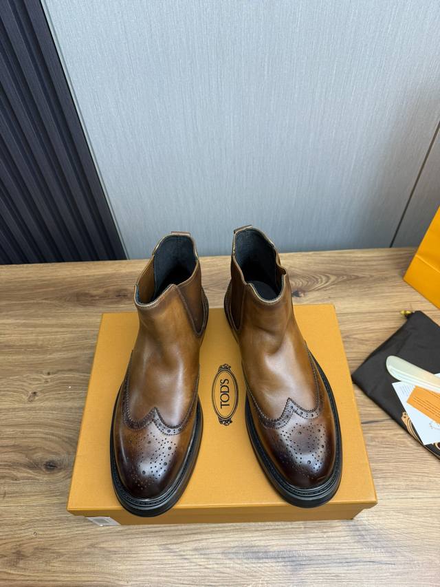/ 工厂价Tods.男士秋冬及踝靴,体现经典的优雅气质 高雅的外观搭配修长的版型,进口牛皮打造,舒适轻盈,套脚式穿脱方便,内里本染小牛皮,超轻发泡大底,后置提鞋环带