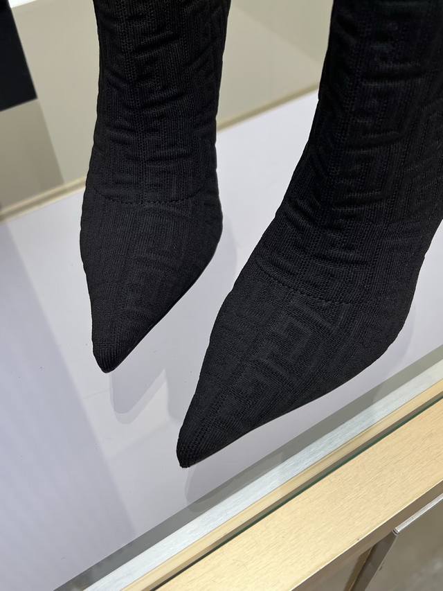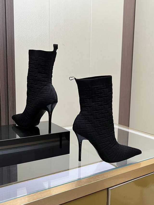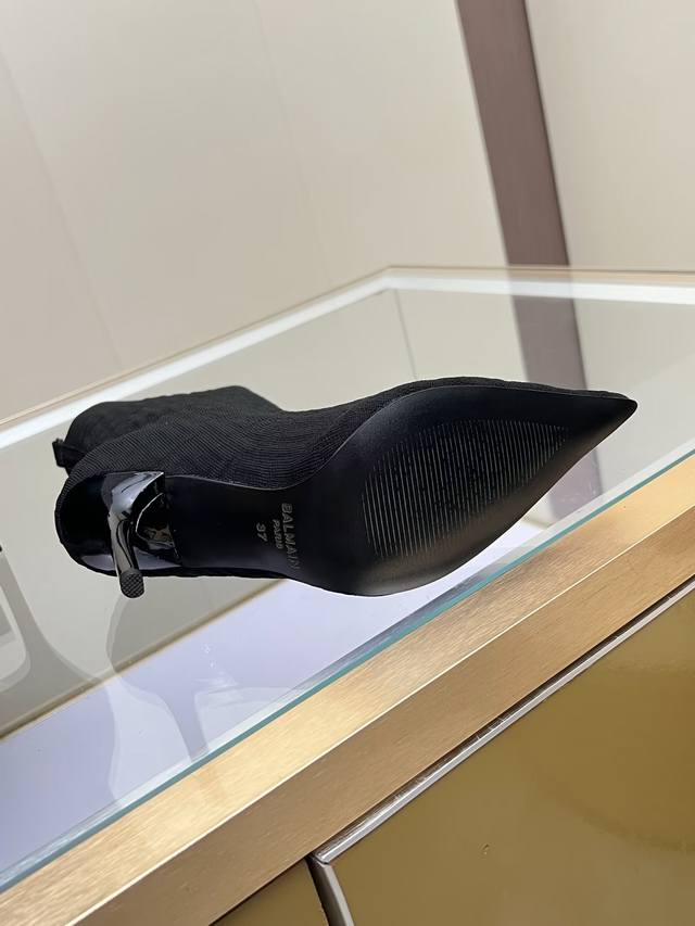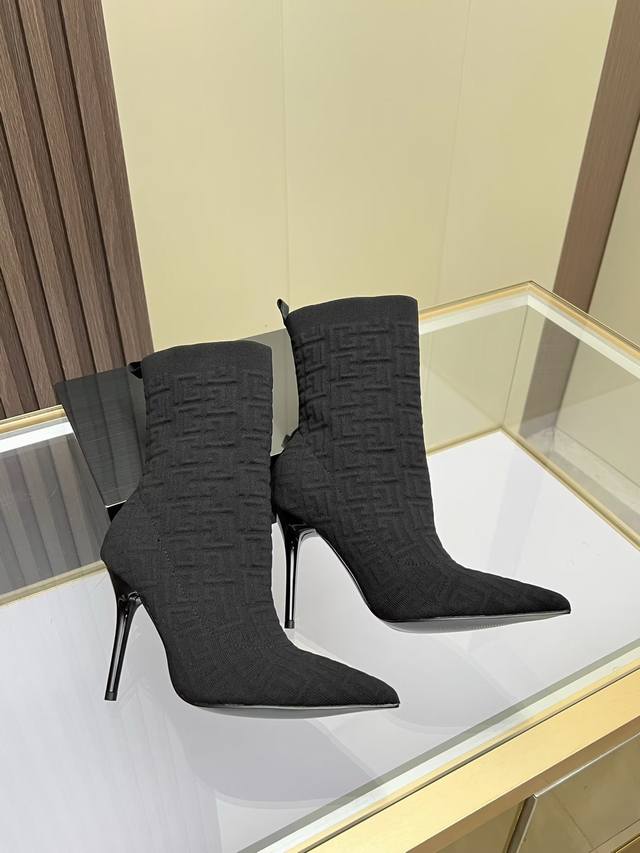 巴尔曼时尚细高跟短靴,飞织弹力面料,内里垫脚羊皮,橡胶大底,跟高10.5Cm,纤细性感,高挑迷人。