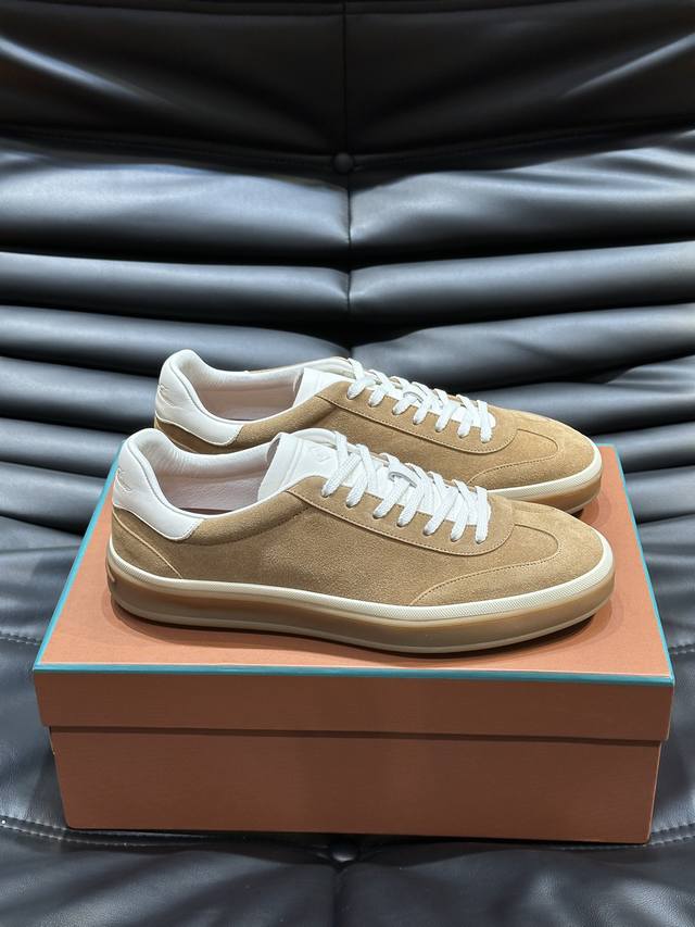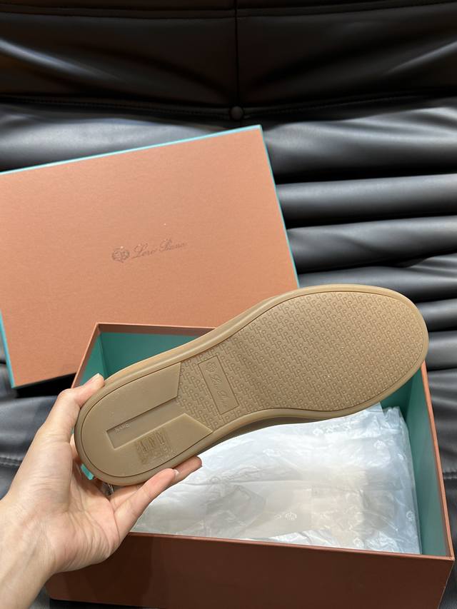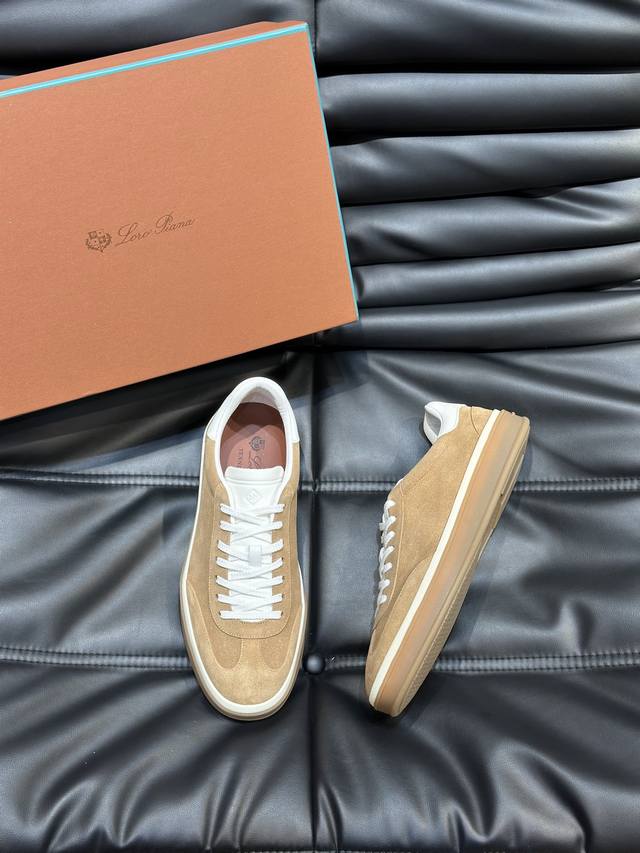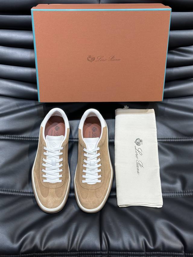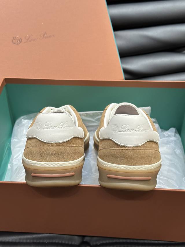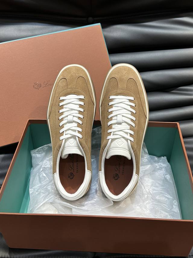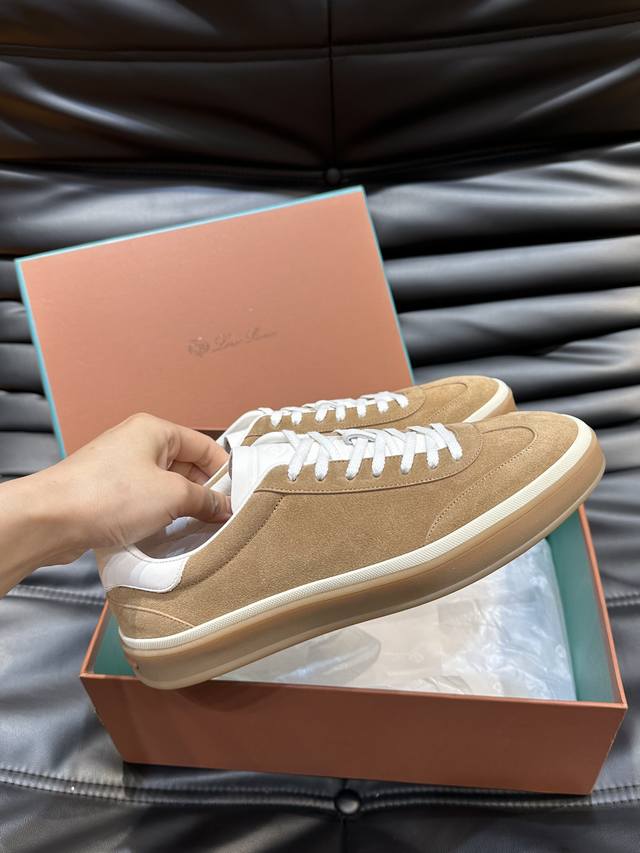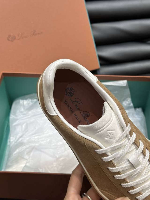 新款lp老钱风男士低帮休闲网球鞋loro Piana高端系列推出了以柔软牛皮制成的运动鞋款式,天然材料的透气属性与柔韧质感,让球鞋兼具功能性与舒适性。高质量的无金属鞣制和翻滚工艺,凸显了皮革的天然纹理,而骆驼色鞋底与白色橡胶饰边营造出的双层鞋底效果,使其也可作为日常鞋履,轻松打造慵懒休闲风格!