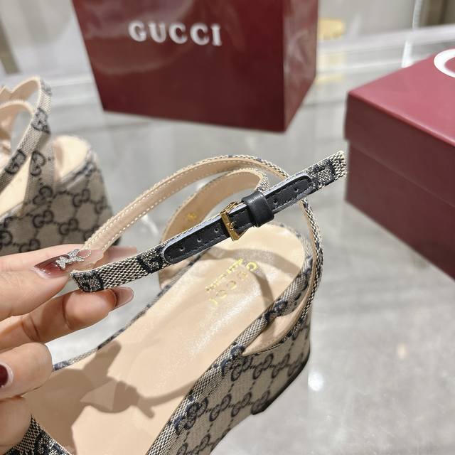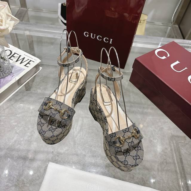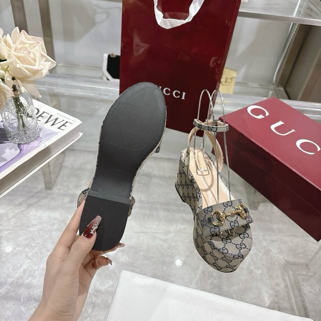 最新爆款女式马衔扣平底中跟防水台凉鞋 标志性的马衔扣定义了这一双皮凉鞋。皮革鞋底和可调节的踝部闭合设计完善了风格,增强了其现代精神。 深蓝色 Gg 帆布 女式