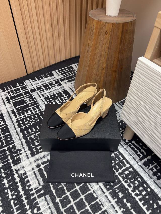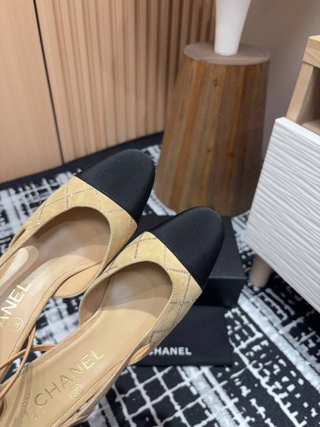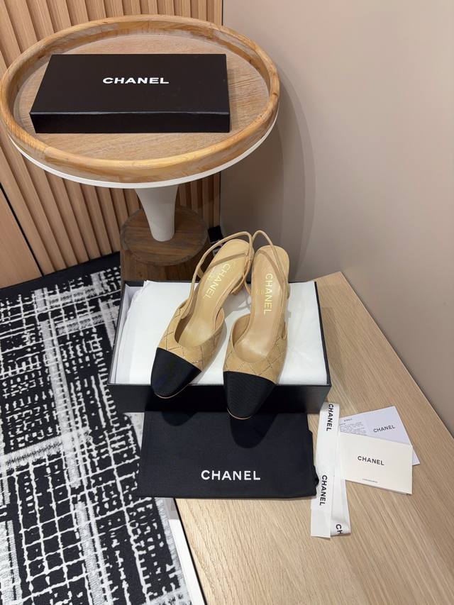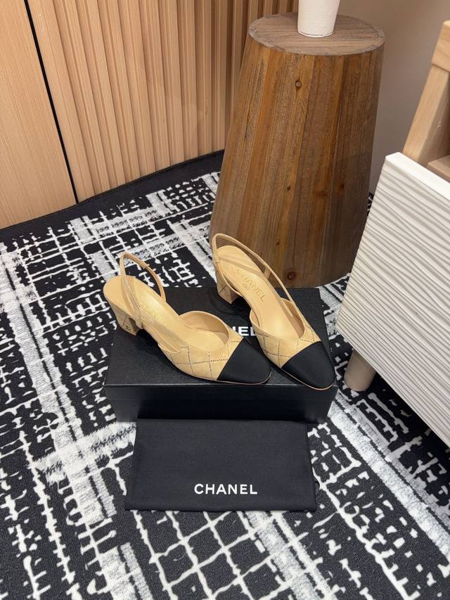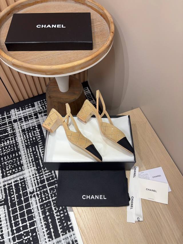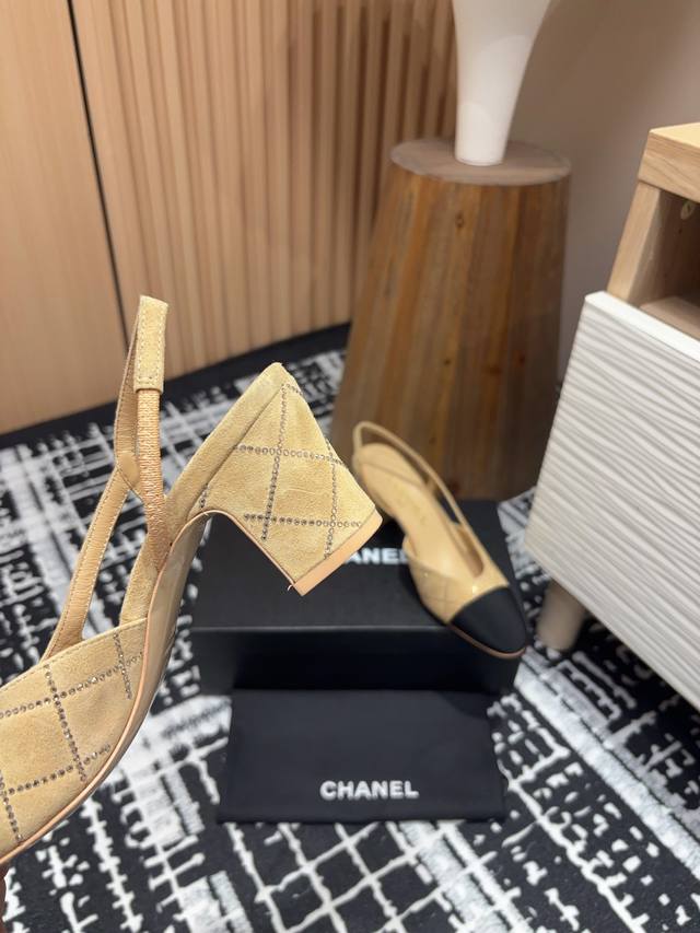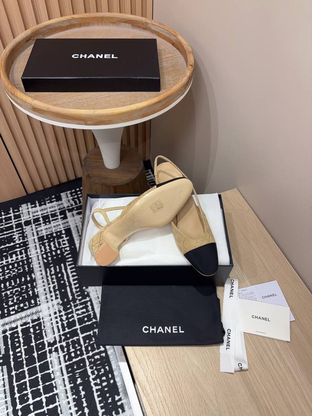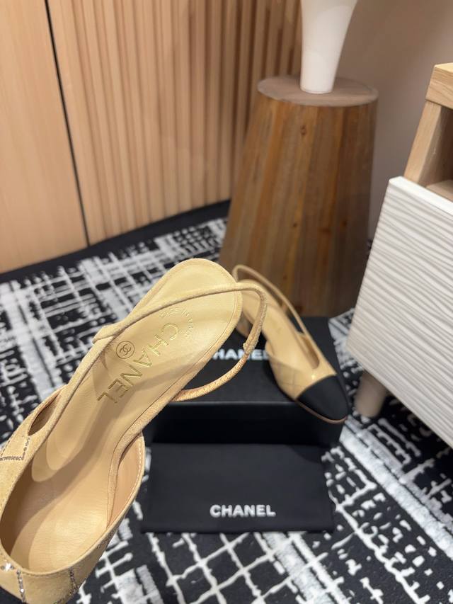 25Fw新款chanel小香烫钻后空sling-Back凉鞋平底 粗跟