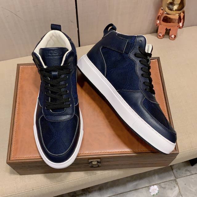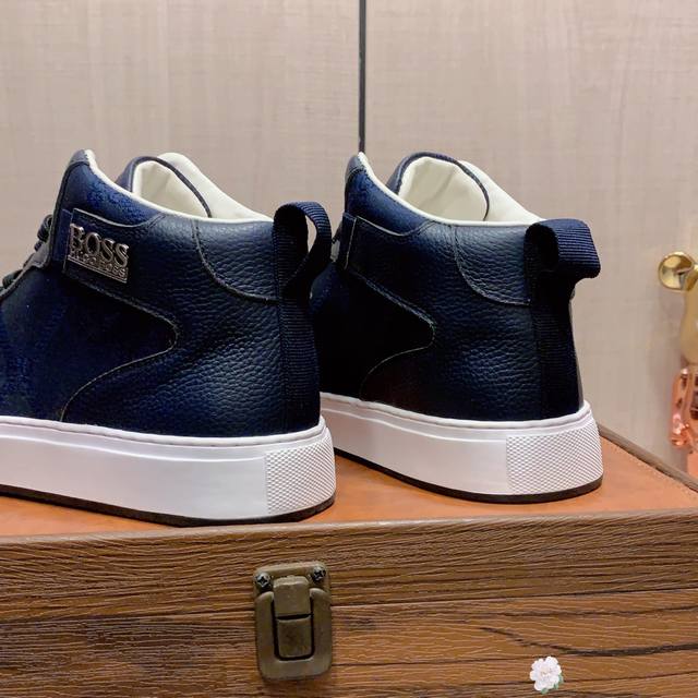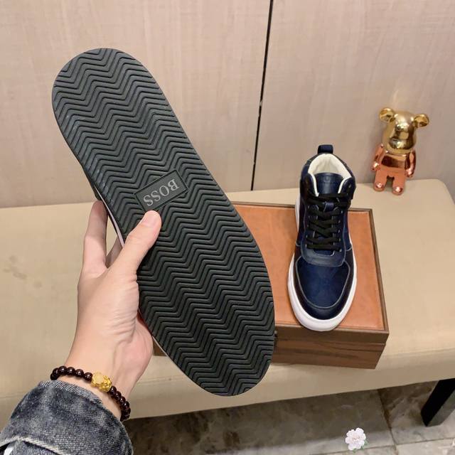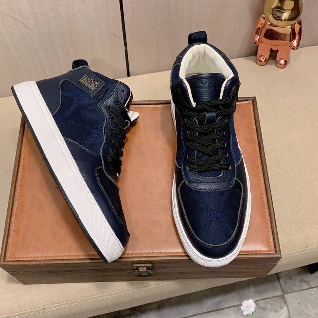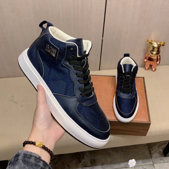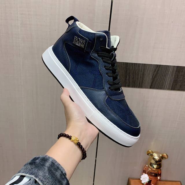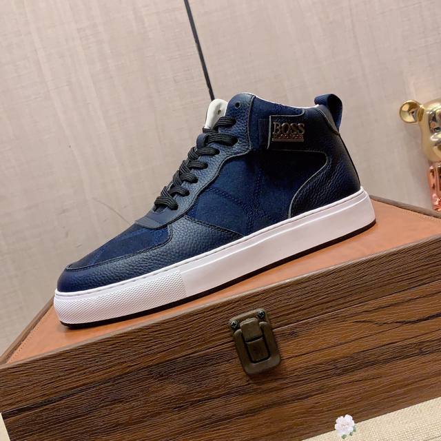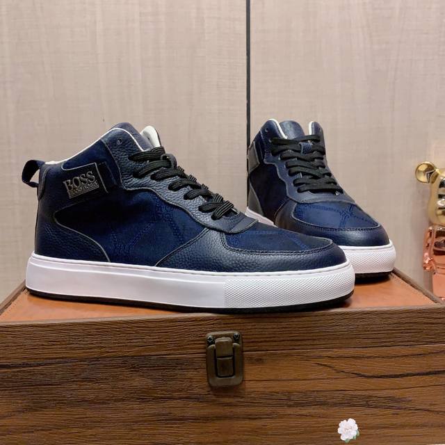 高帮新款: 厂价: Boss* 最新爆款休闲鞋,顶端品牌奢侈~代购,顶级~质量。鞋面選用进口透气牛皮搭配布料材质透气羊皮垫脚 精细做工。原版个性时尚柔软橡膠耐磨