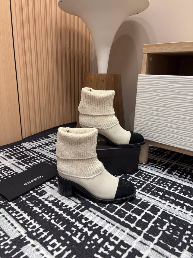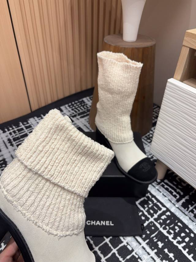 24Ss秋冬新款chanel小香粗跟毛线短靴