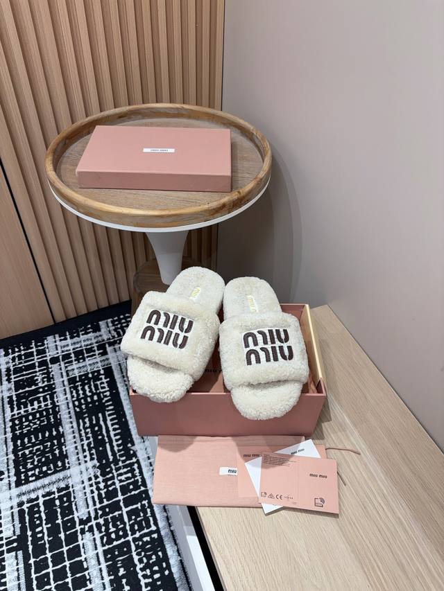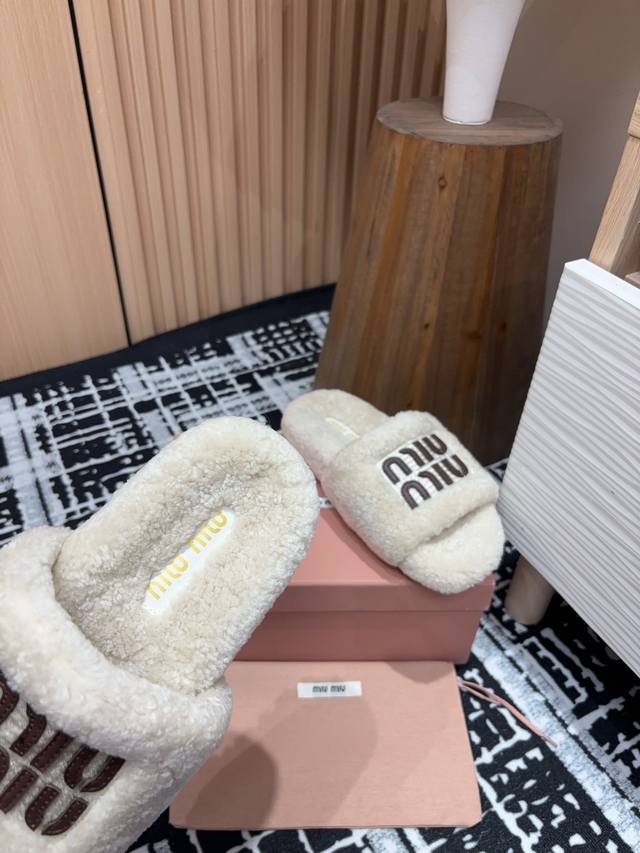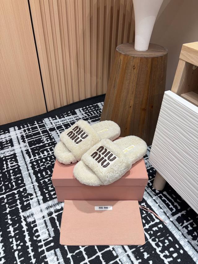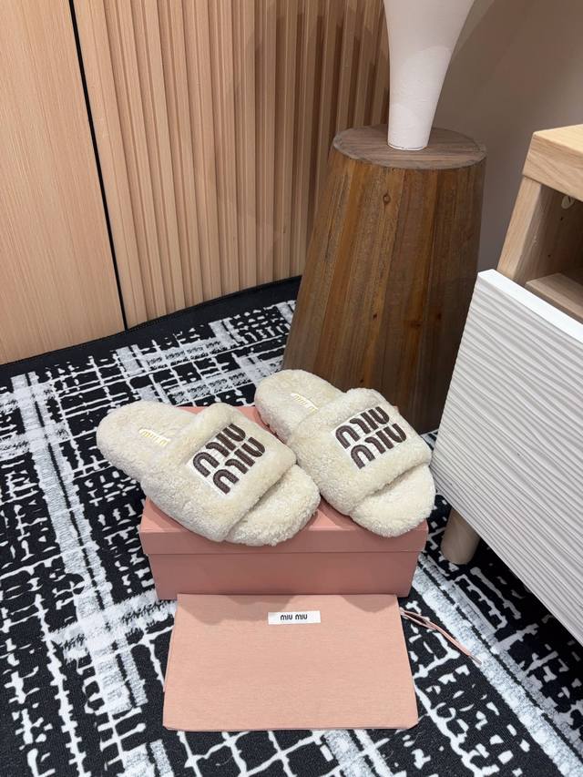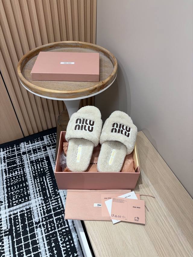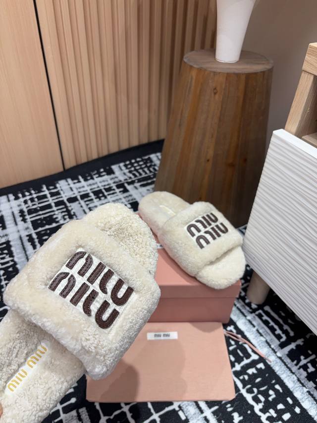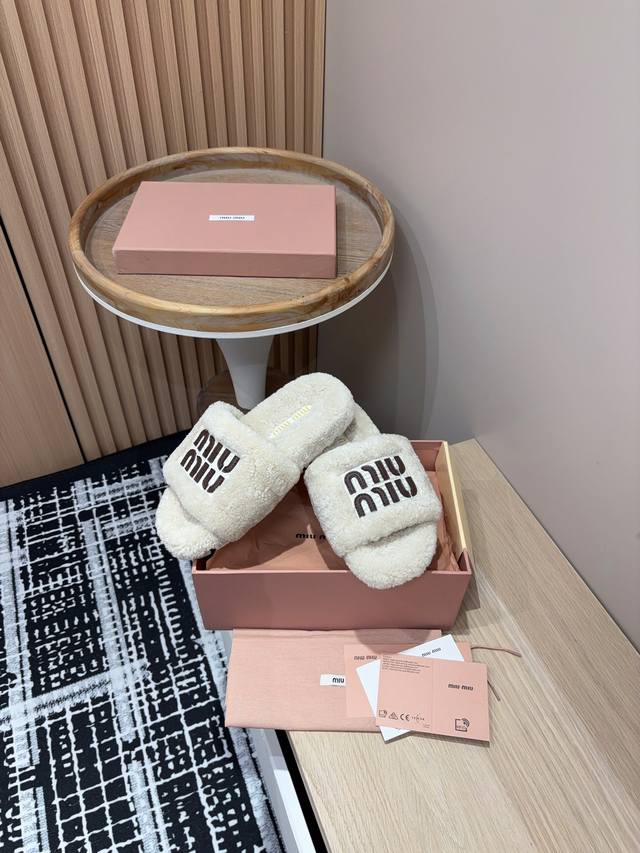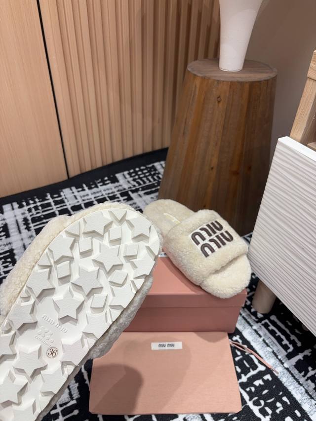 24Ss秋冬新款miu miu字母一字羊毛拖鞋 鞋面:羊羔毛 内里:羊羔毛 鞋底:橡胶鞋底 码数:35-39 40,41定制不退换