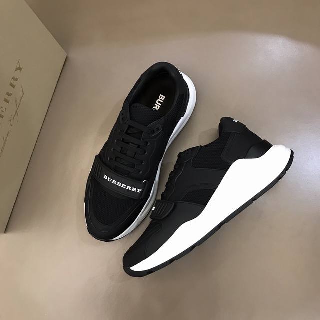 / b家男士增高运动鞋!高端品质,鞋面由小牛皮和帆布拼接,整体低调又不失时尚,脚后跟滴胶品牌burberr*字样logo,小牛皮表面毛孔细腻柔软光滑,富有弹性,经久