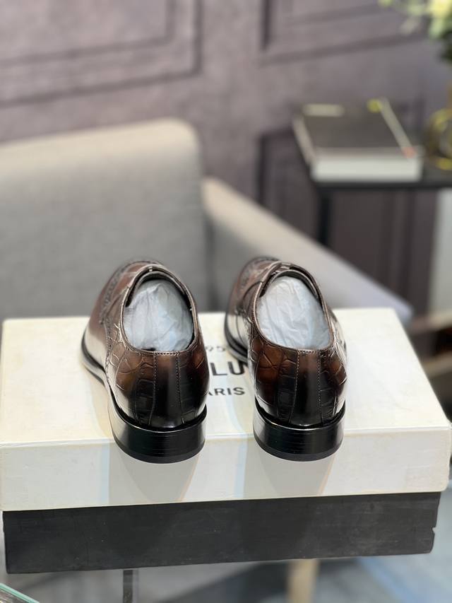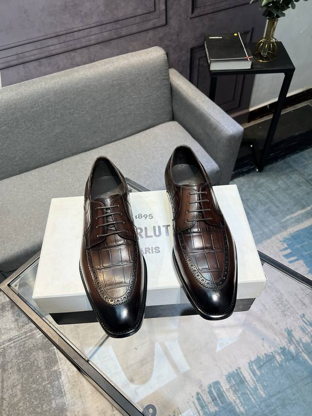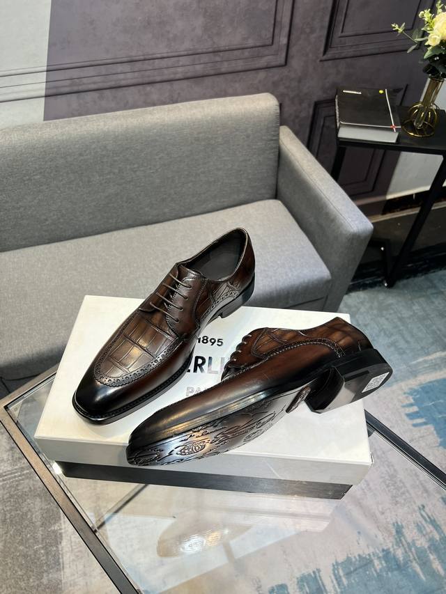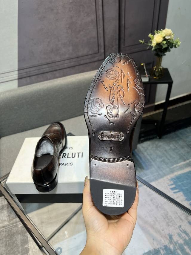 berlut* 布鲁提新款男士手工擦色正装皮鞋|甄选优质进口小牛皮鞋面|手工擦色工艺处理效果|鞋面饰以不对称 Scritto 图纹刺青彰显着berlut* 的细节与精神传承|半固特异冷粘工艺古朴大气|将皮料质感展现得淋漓精致|手工改色擦色特色|内里水染小牛皮 意大利真皮大底后跟加入橡胶底片防滑效果极好|搭配原版私模徽章鞋拔|原版定制包装发售