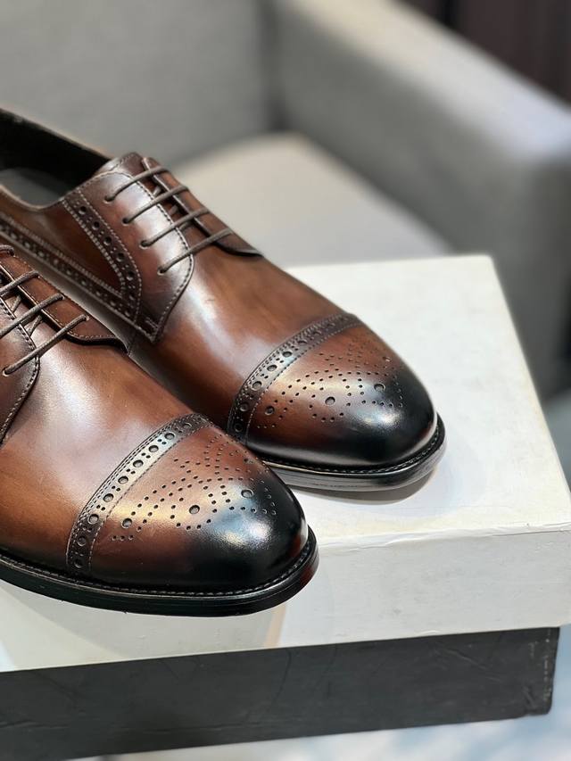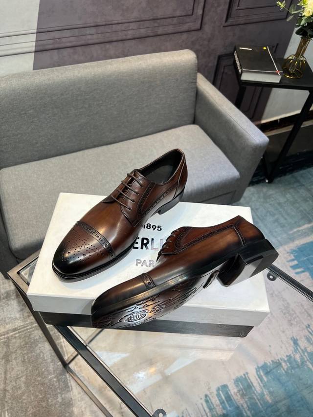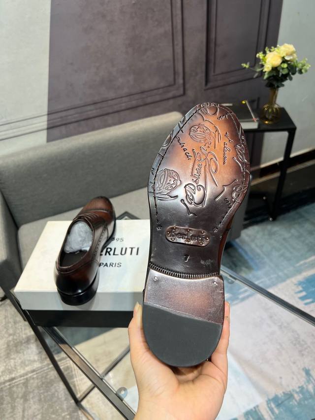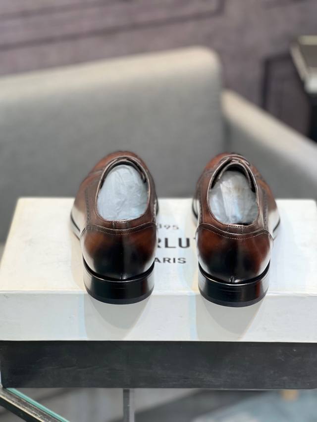 Berlut* 布鲁提新款男士手工擦色正装皮鞋|甄选优质进口小牛皮鞋面|手工擦色工艺处理效果|鞋面饰以不对称 Scritto 图纹刺青彰显着berlut* 的细节与精神传承|半固特异冷粘工艺古朴大气|将皮料质感展现得淋漓精致|手工改色擦色特色|内里水染小牛皮 意大利真皮大底后跟加入橡胶底片防滑效果极好|搭配原版私模徽章鞋拔|原版定制包装发售