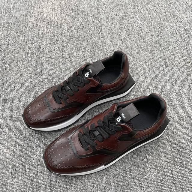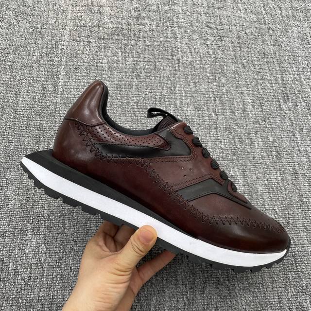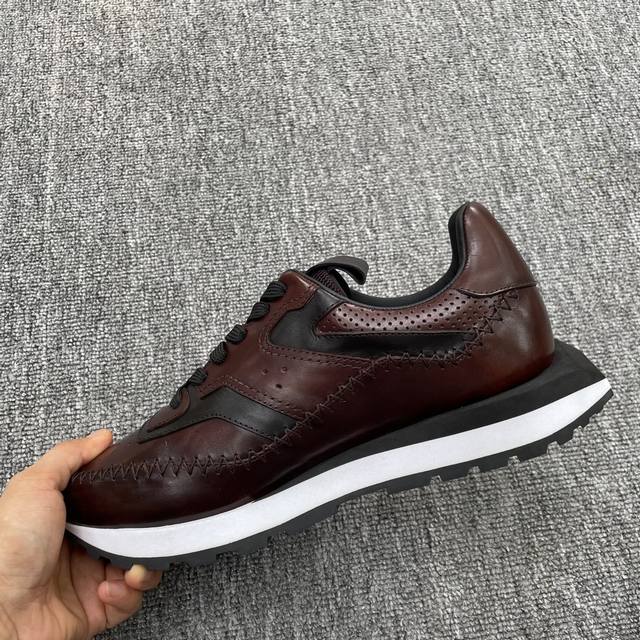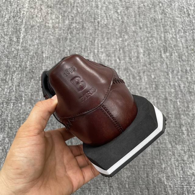 BERLUTI 布鲁提 新款Pulse男士皮革运动鞋,Berluti 的历史回溯至 1895 年的巴黎,历来由四代的家族成员经营,以深厚的制楦技艺、渊博的高级鞋艺知识、对皮革和Patina漂染技术的热情,拓展品牌的高尚美学。这款运动鞋采用全新的设计美学,不同质感不同颜色的材质撞色拼接设计,时尚又潮流 、优雅又轻盈。小牛皮和尼龙鞋面,牛皮垫脚棉内里,双色橡胶大底,上脚舒适透气,衬托个性!