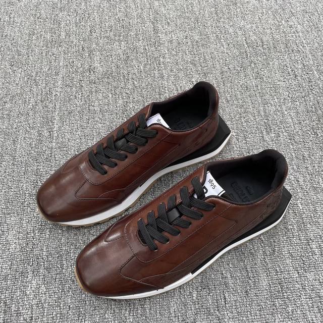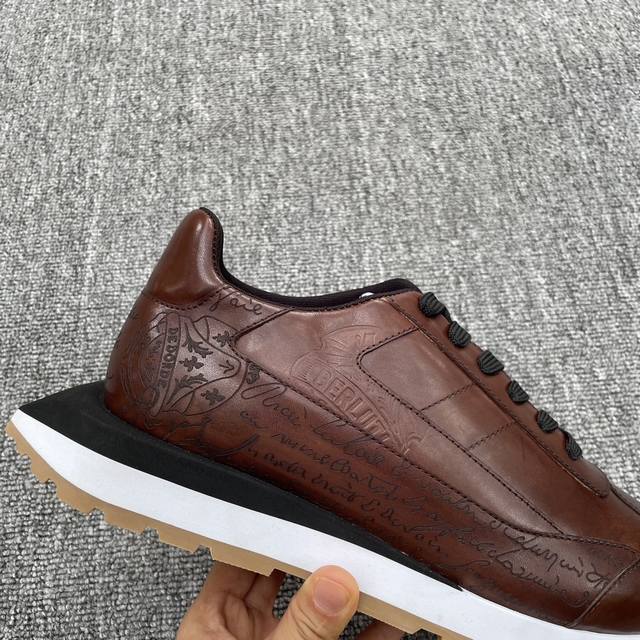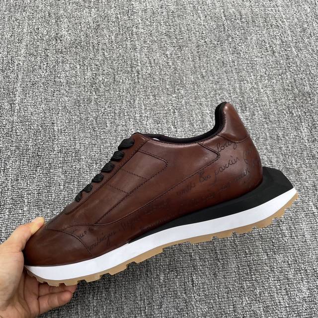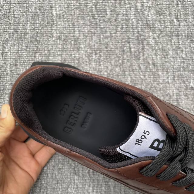 BERLUTI 布鲁提 新款Pulse男士皮革运动鞋,Berluti 的历史回溯至 1895 年的巴黎,历来由四代的家族成员经营,以深厚的制楦技艺、渊博的高级鞋艺知识、对皮革和Patina漂染技术的热情,拓展品牌的高尚美学。这款运动鞋采用全新的设计美学,不同质感不同颜色的材质撞色拼接设计,时尚又潮流 、优雅又轻盈。小牛皮和尼龙鞋面,牛皮垫脚棉内里,双色橡胶大底,上脚舒适透气,衬托个性!
