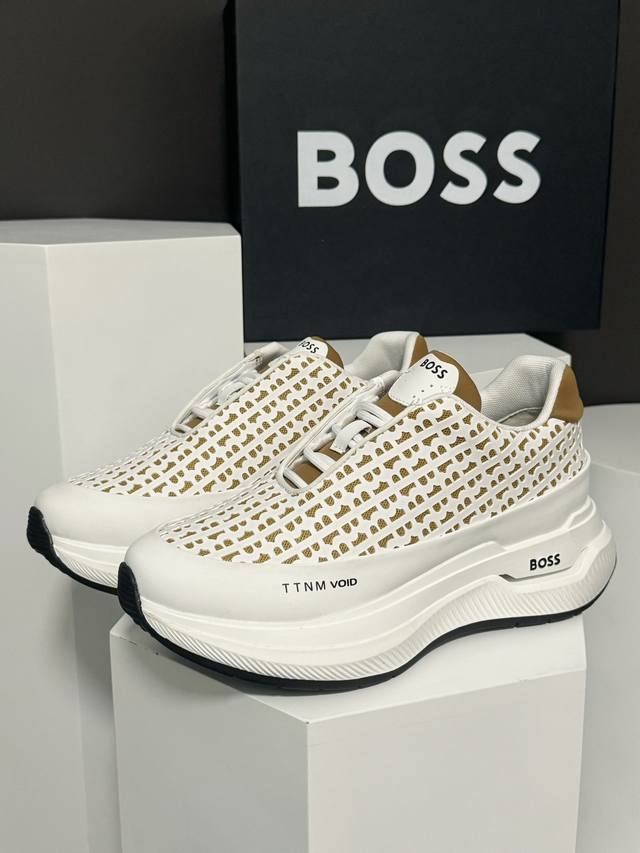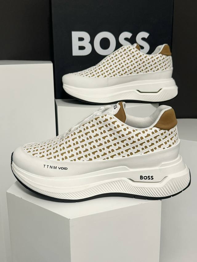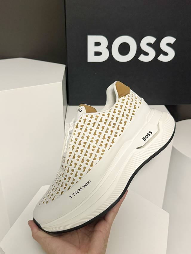 Boss动感男款厚底运动鞋,优雅低调而又蕴藏轻盈活力。精选内皮搭配高弹力飞织!饰有品牌标识,前卫厚鞋底设计。层次感和科技感十足,让人眼前一亮的时尚单品。 Siz
