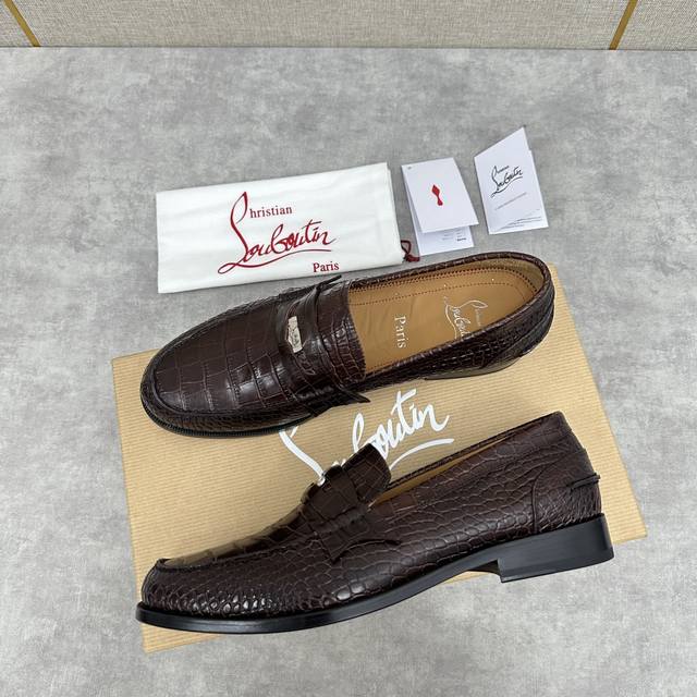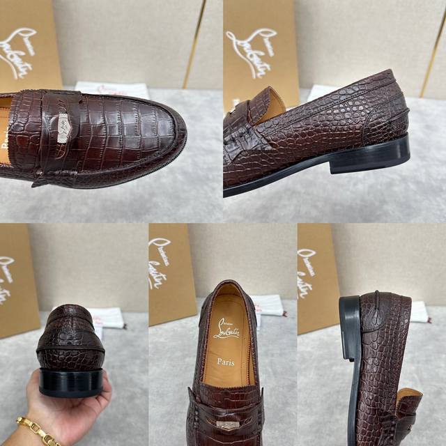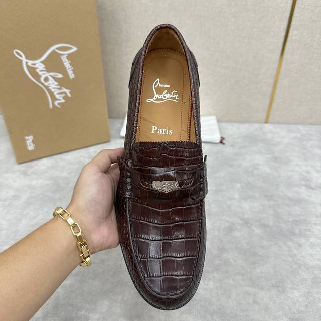 / CL 新品乐福鞋皮鞋 Christia* Loubouti* 红底鞋 最新推出此款便鞋 帮面采用进口擦色开边珠牛皮 头层牛皮 牛皮压鳄鱼鞋面倒三角包裹圆形硬币扣