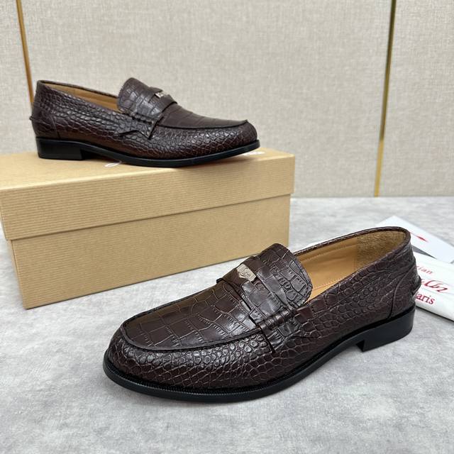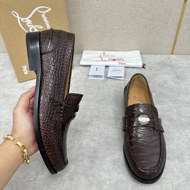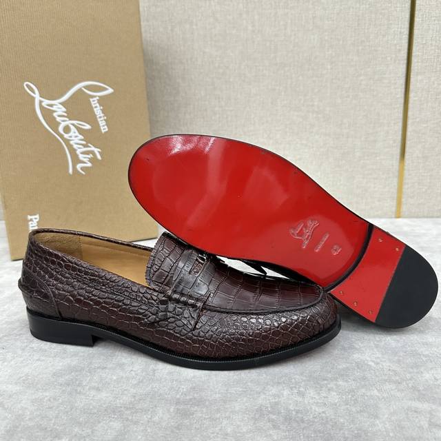CL 新品乐福鞋皮鞋 Christia* Loubouti* 红底鞋 最新推出此款便鞋 帮面采用进口擦色开边珠牛皮 头层牛皮 牛皮压鳄鱼鞋面倒三角包裹圆形硬币扣金属logo标识 标志性红色大底、极致个性的鞋款 原色牛皮内里 意大利原版真皮大底;精细做工 带给您奢华体验 精致细节点缀于经典廊形之中,随性重构绅士态度懒人专属一脚蹬套脚穿着 标准皮鞋码数: 39~44# 38.45.46定做