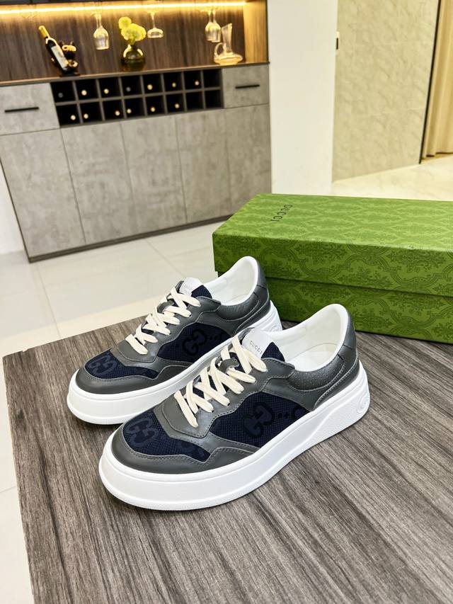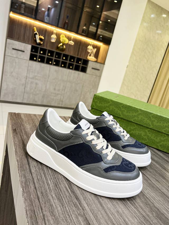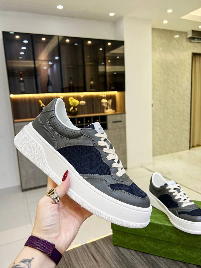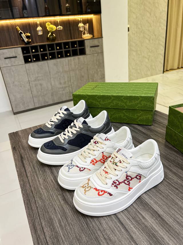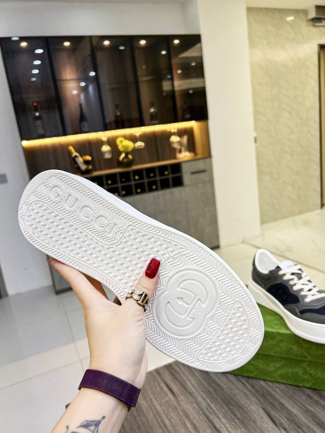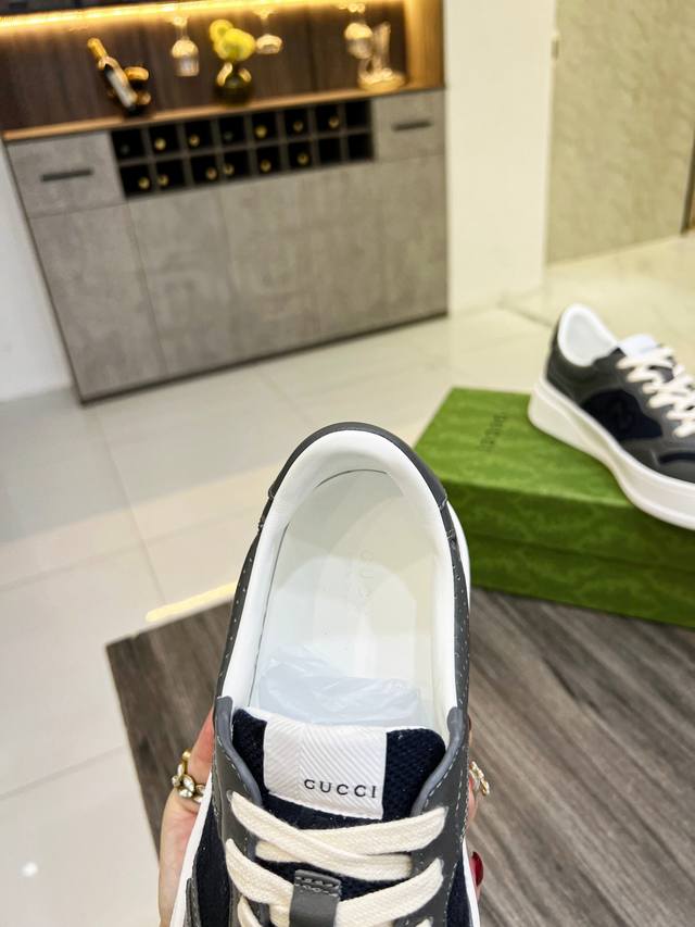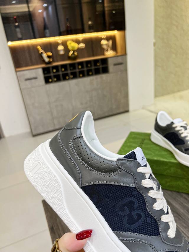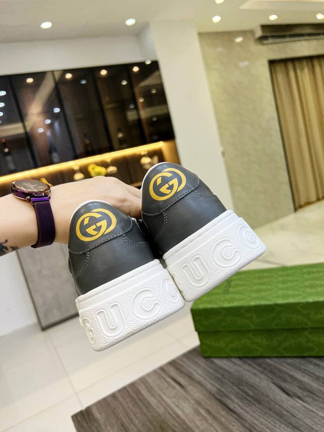 g家最新爆款厚底小白鞋运动与休闲混搭设计既有潮流的理念又有复古风的气息。全新系列继续从其他时代的日常生活中寻找灵感,并融入当下的设计精髓Gg 印花压纹皮革制作,饰以经典双 G 字母交织图案,尽显深厚的品牌标识内涵