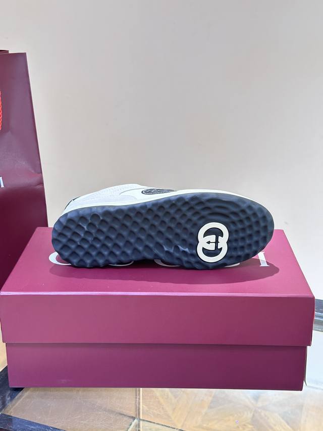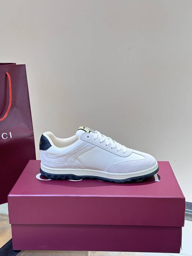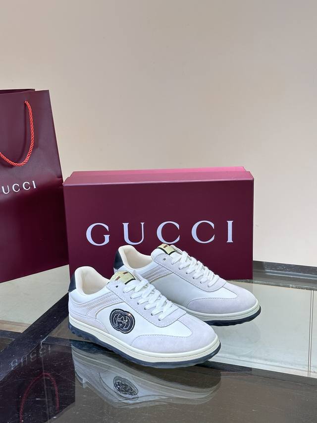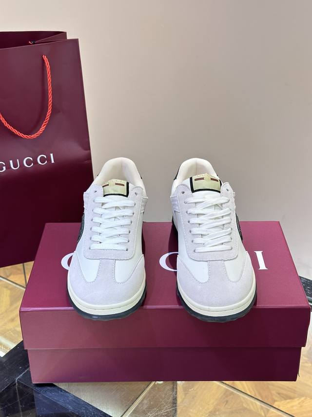 / Guc*I~男士休闲运动鞋, 休闲复古小白鞋 顶级品质 品相完美 精致小巧的互扣式双g标识浪漫诠释此系列的美学理念 选用黑色色皮革,复古灵感巧妙融于运动鞋设计,