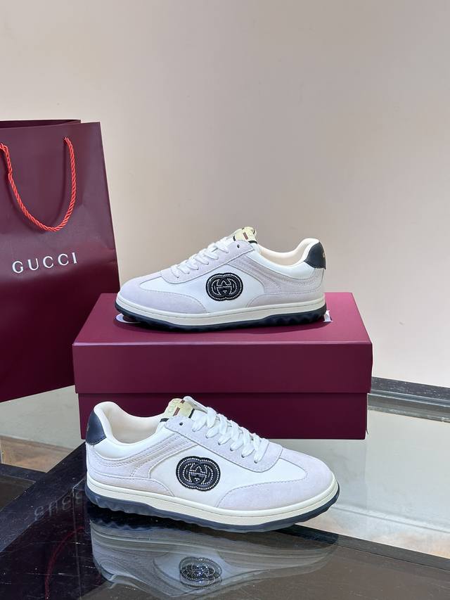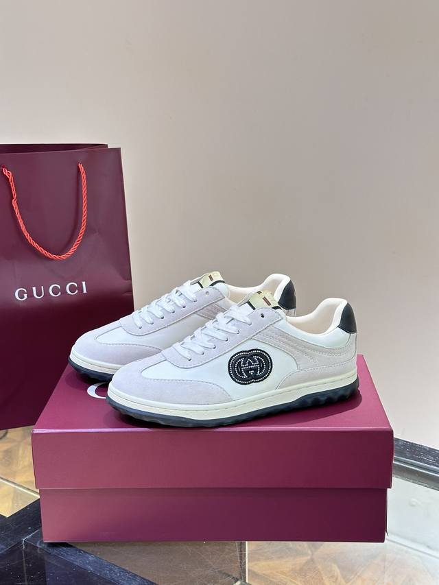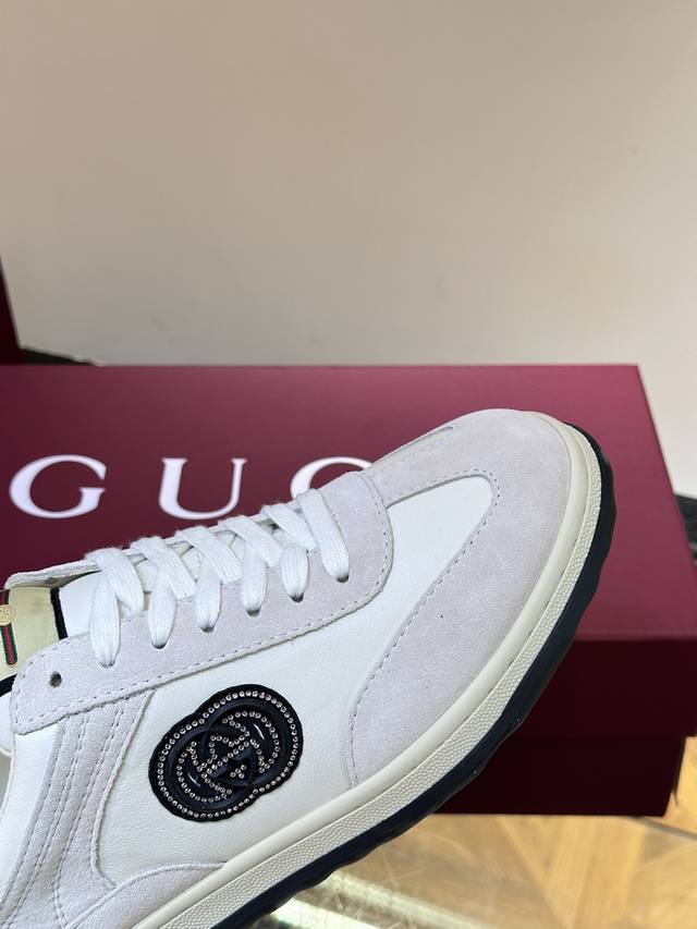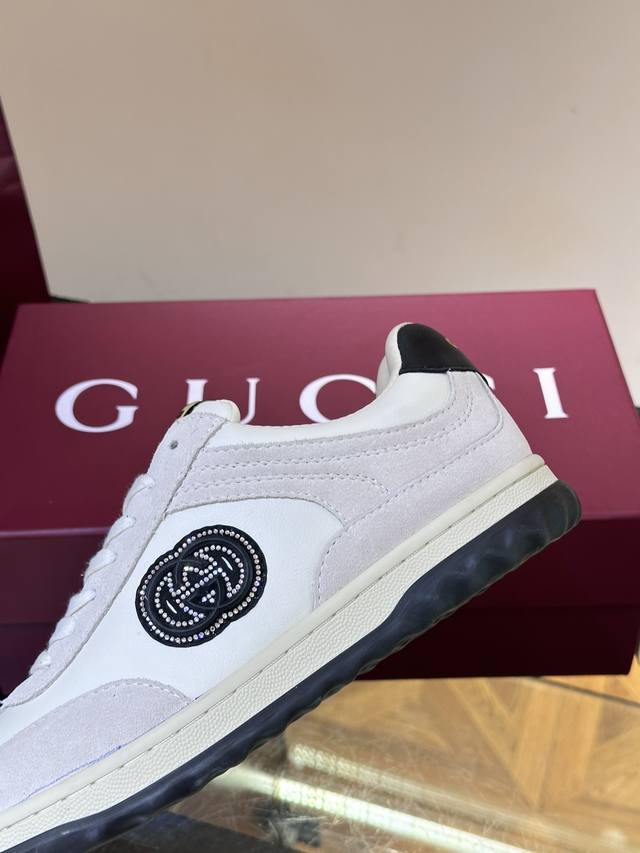 Guc*I~男士休闲运动鞋, 休闲复古小白鞋 顶级品质 品相完美 精致小巧的互扣式双g标识浪漫诠释此系列的美学理念 选用黑色色皮革,复古灵感巧妙融于运动鞋设计,焕新演绎品牌标识 侧面互扣式双g烫钻设计 原版开模双色tpu大底!