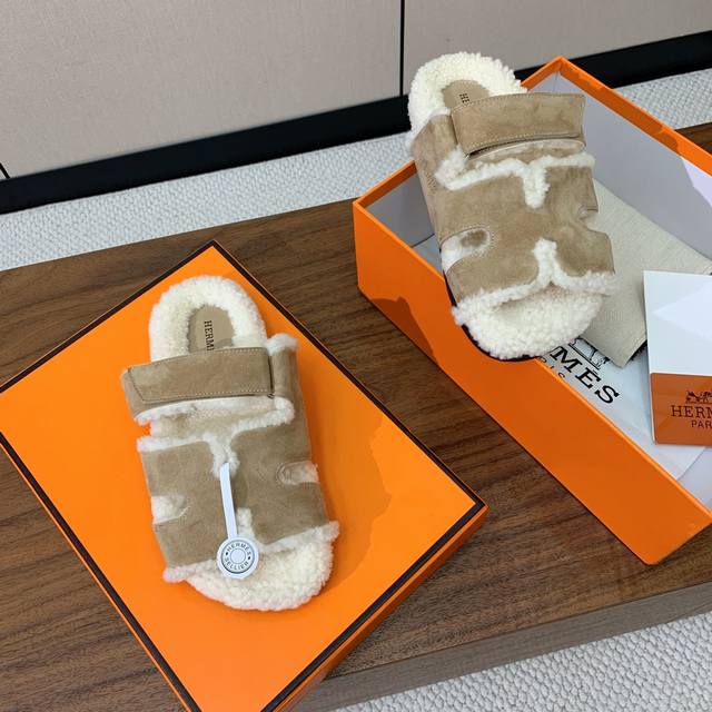 Herm*S 秋冬毛拖 丑萌丑萌的 搭配各种彩色袜子潮爆了 鞋面进口羊京 羊羔毛内里及垫脚 Tpu防滑耐磨大底