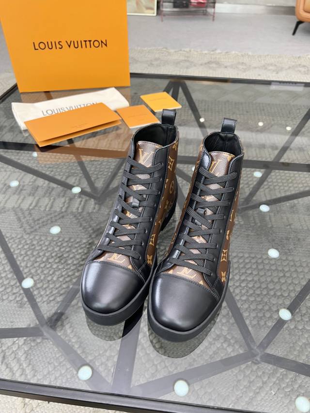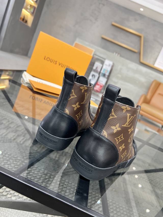 / L 顶级代购 路 炸街男神高帮靴子爆款运动板鞋专柜同步,鞋面意大利进口牛皮搭配老花面料,超经典版面高品质拼接复杂工艺品,进口水染牛皮内里牛皮垫脚 鞋底:原厂特供