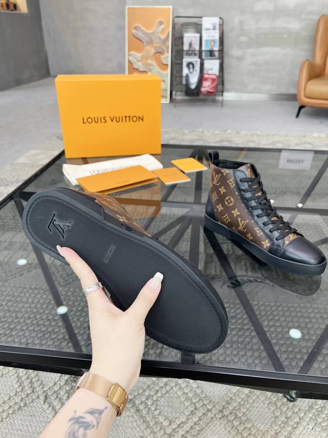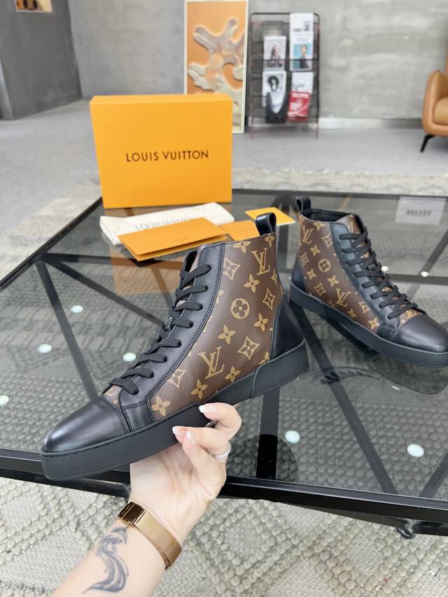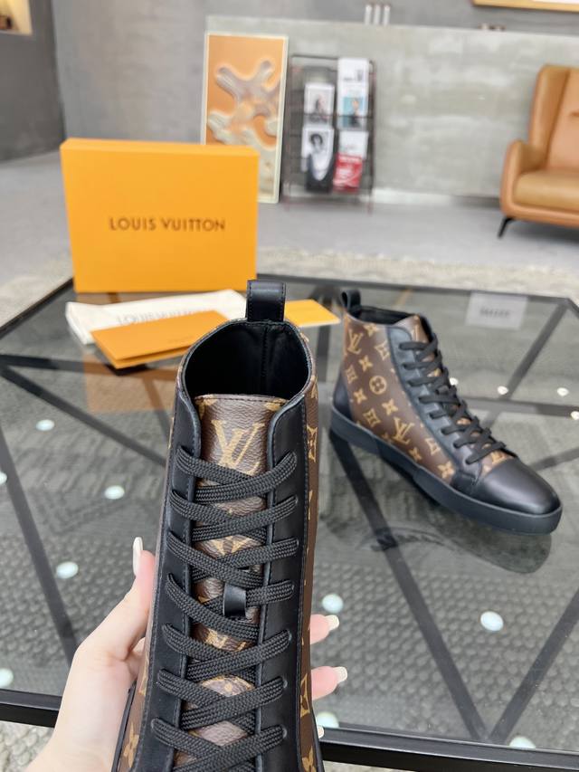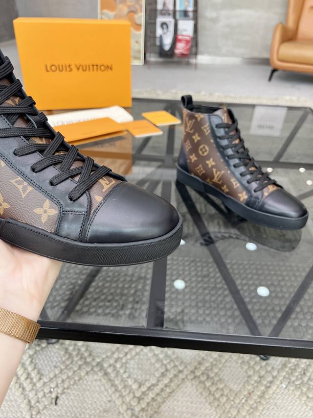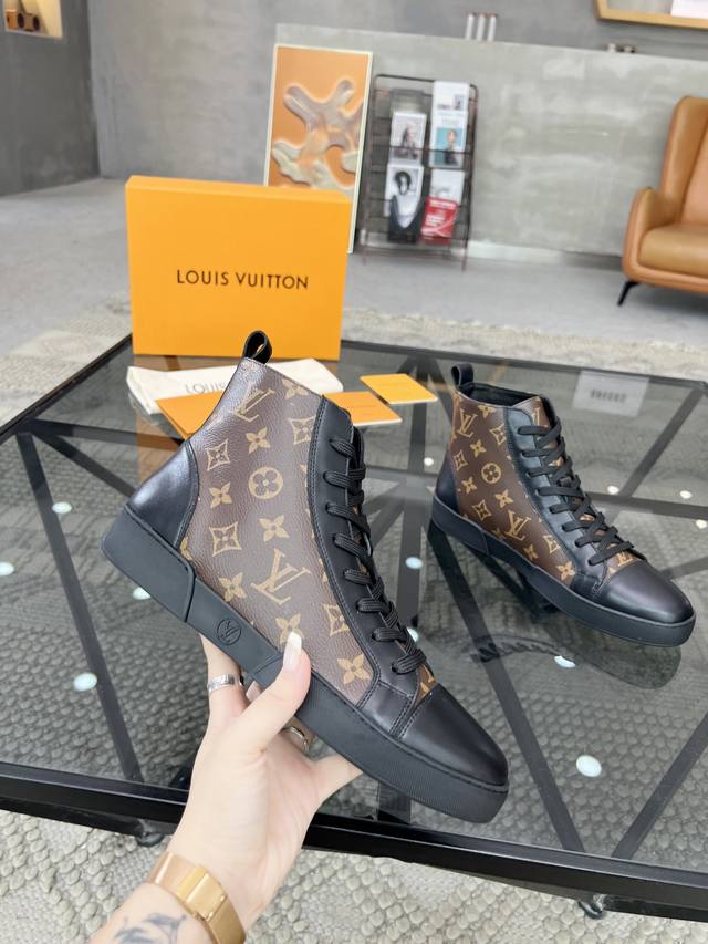 L 顶级代购 路 炸街男神高帮靴子爆款运动板鞋专柜同步,鞋面意大利进口牛皮搭配老花面料,超经典版面高品质拼接复杂工艺品,进口水染牛皮内里牛皮垫脚 鞋底:原厂特供原版底,TPU独家活动成型底超级舒适,原厂跟单货,高品质,可随意进出专柜,欢迎对比,码数 39-44 可订38 45