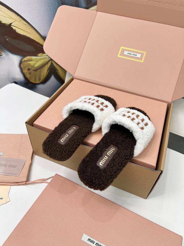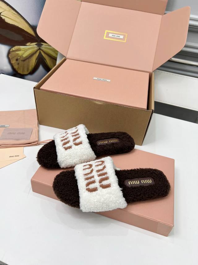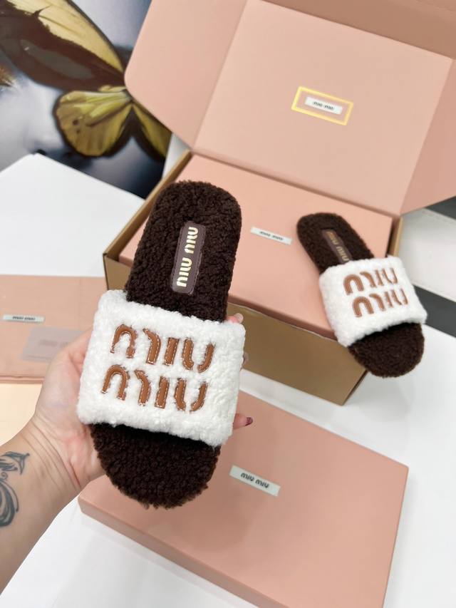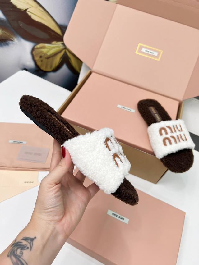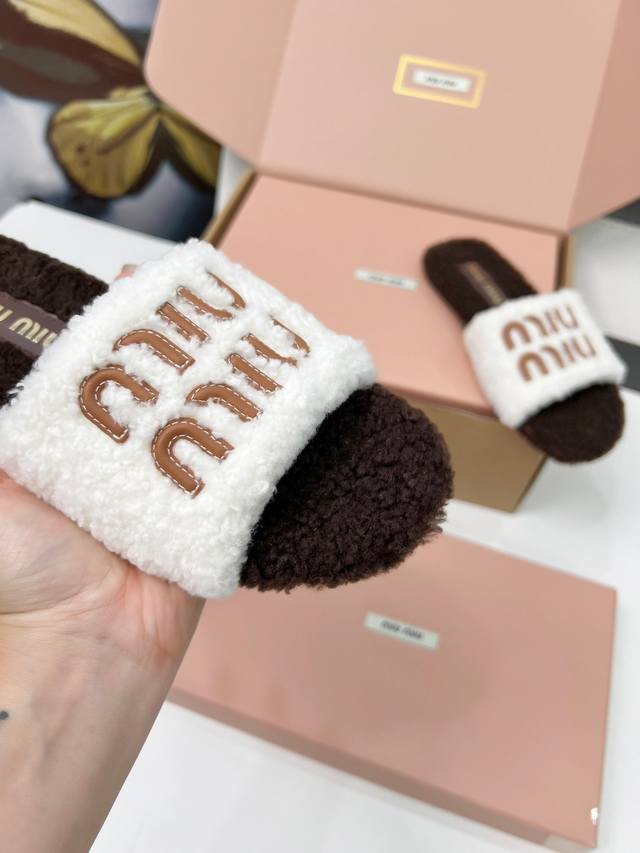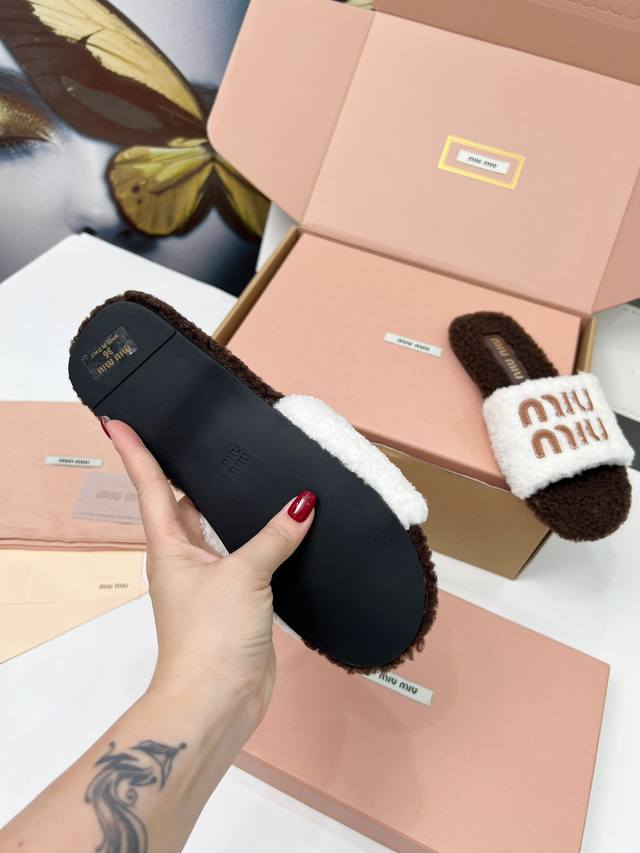 miumiu 平底毛毛拖鞋,毛茸茸材质裹着脚超暖和,软乎乎的踩感像踩云朵,完全不磨脚。 简约设计不挑风格,日常穿既显精致,又能轻松提升穿搭氛围感。 法式浪漫感拉