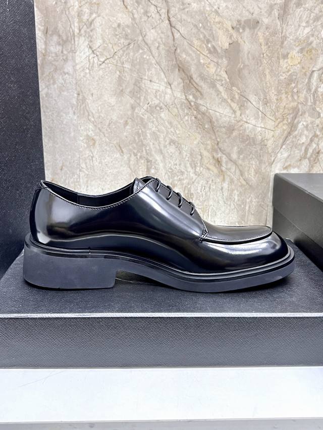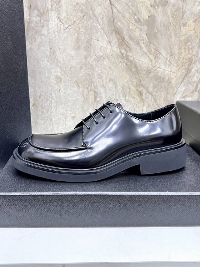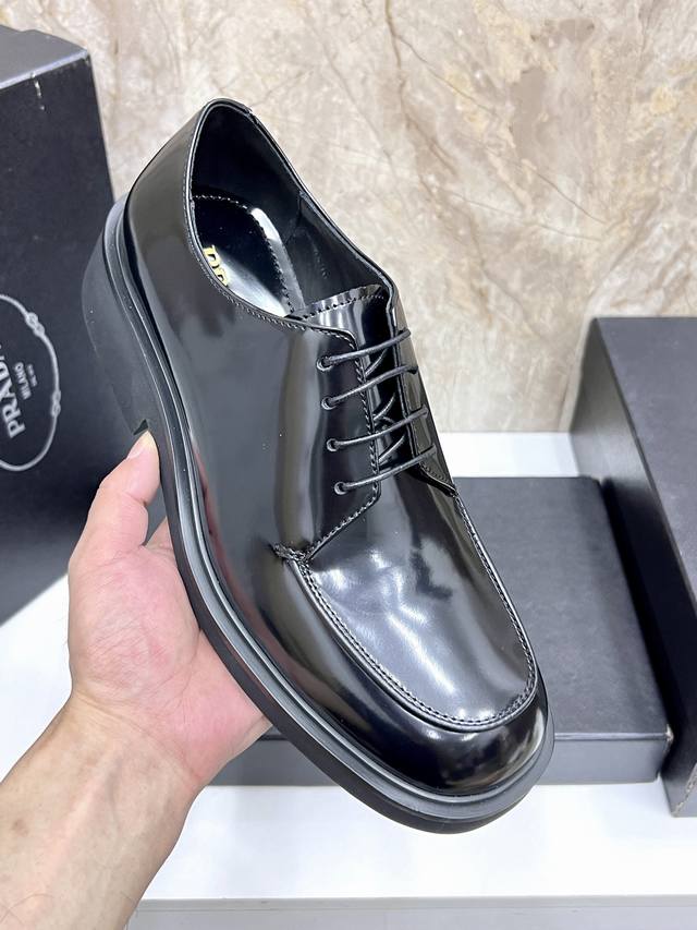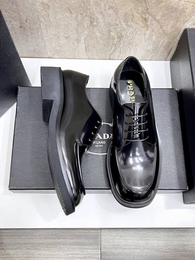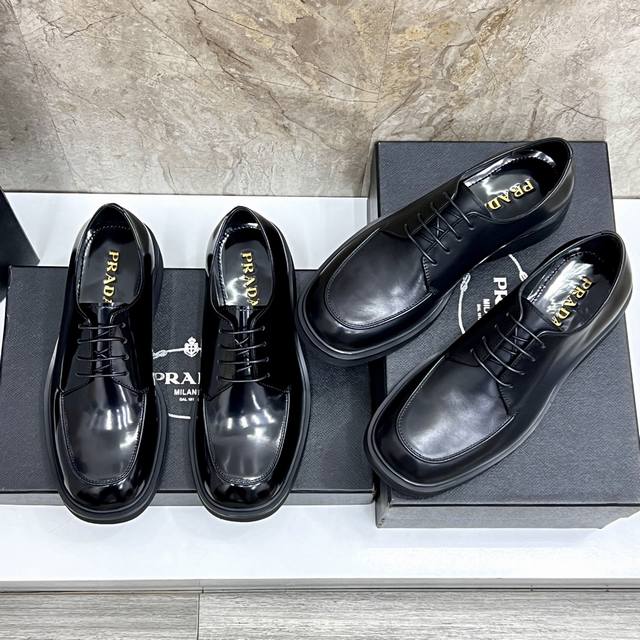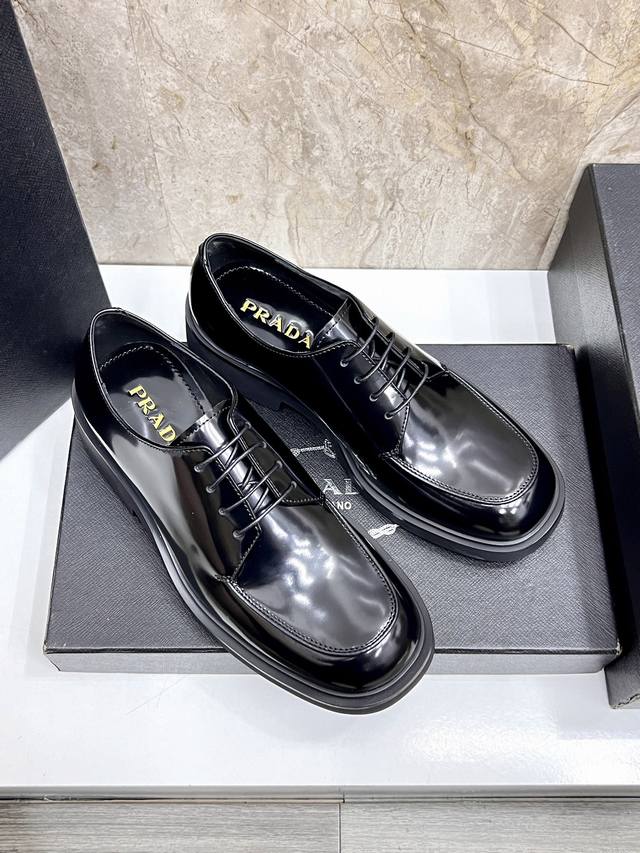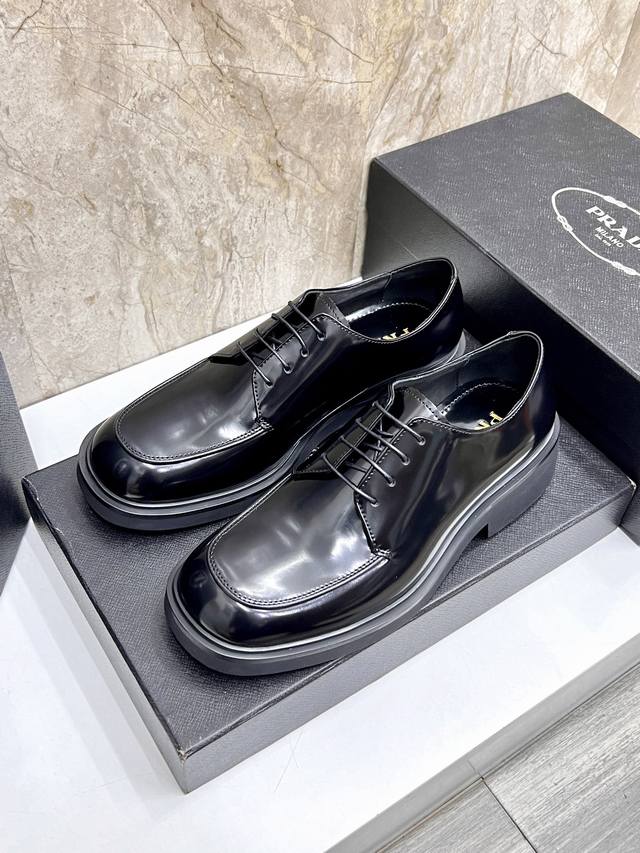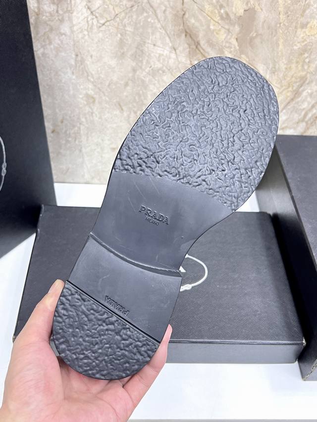 prad*家高端经典男士乐福鞋,邂逅崭新量感与精致细节,呈现焕新设计。采用进口开边珠牛皮材质,装点三角形徽标、贴边缝线,橡胶鞋底搭配别致凹口细节。这款单品具有复古设计风格,呈现混搭格调。复古鞋面呈现方正线条,与充满现代感的粗壮厚底形成对比,将不同廓形和传统设计元素兼收融合。三角形徽标和亮面皮革,为鞋履平添标志性特色。亮面皮革是品牌经典材质,历经时光洗礼,光彩依旧。