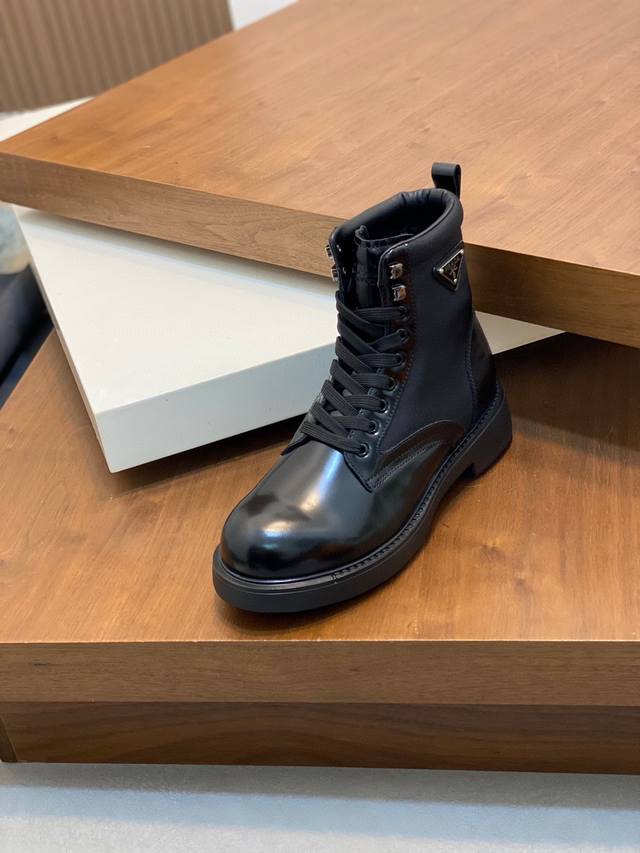 prada 秋冬男士最新超轻新款短羊毛靴 ,双色兰 尼龙牛面皮配孔眼和金属钩扣 涂珐琅三角形金属徽标,4M超轻质锯齿 Ev A射出橡胶凹凸大颗粒雪花纹防滑鞋底 脚感非常轻盈舒服 都市现代感军靴格调设计 男款39 40 41 42 43 44