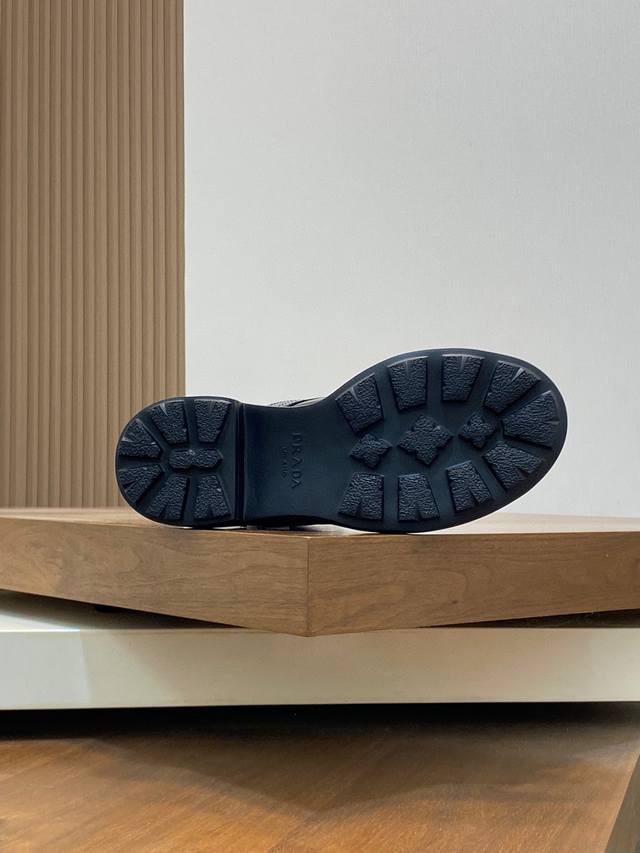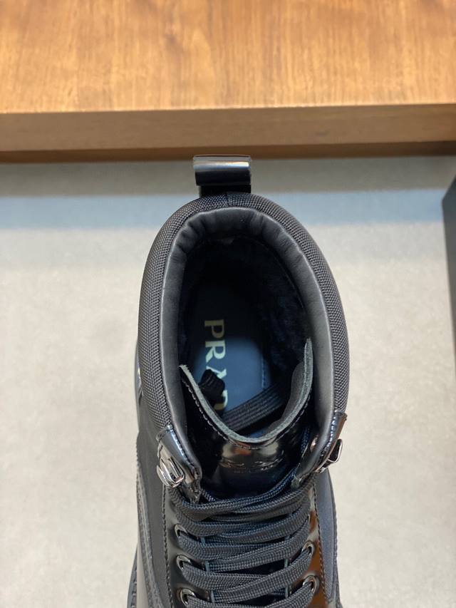 / prada 秋冬男士最新超轻新款短羊毛靴 ,双色兰 尼龙牛面皮配孔眼和金属钩扣 涂珐琅三角形金属徽标,4M超轻质锯齿 Ev A射出橡胶凹凸大颗粒雪花纹防滑鞋底