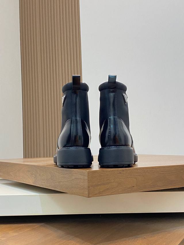 prada 秋冬男士最新超轻新款短羊毛靴 ,双色兰 尼龙牛面皮配孔眼和金属钩扣 涂珐琅三角形金属徽标,4M超轻质锯齿 Ev A射出橡胶凹凸大颗粒雪花纹防滑鞋底