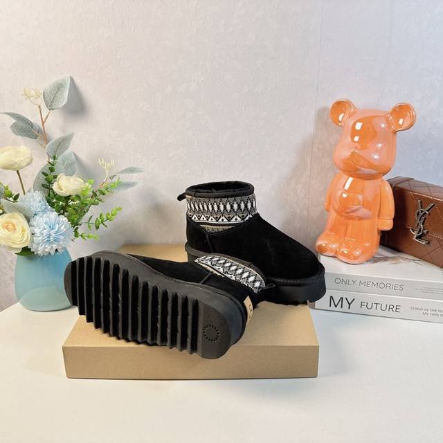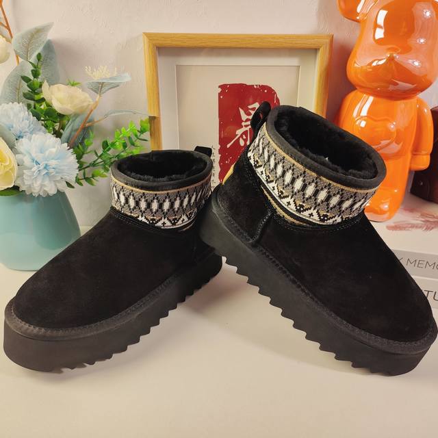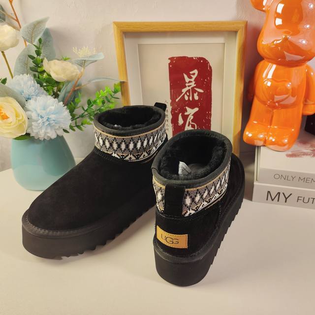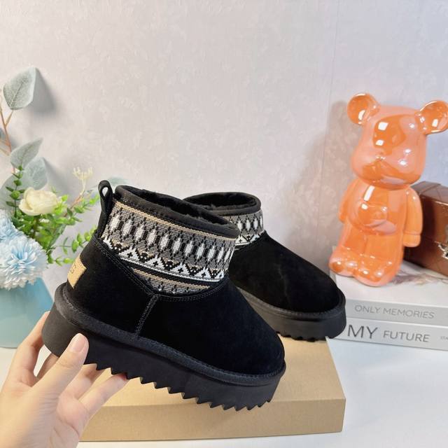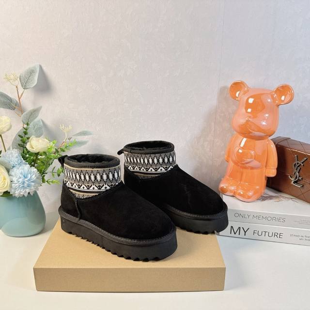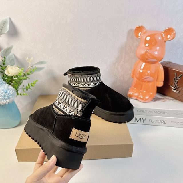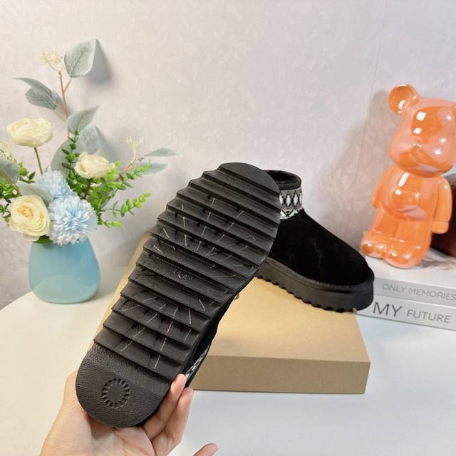 ugg- 黑色 厚底一脚蹬懒人鞋周冬雨同款民族风雪地靴,口一圈民族风复古又时髦,时尚感拉满100分,嘎嘎显高,显腿长,居家办公,室内外皆可,设计穿脱方便,异域风情~民族风的设计,让人眼前一亮,绝对值得入手的一件哟~大底厚4Cm