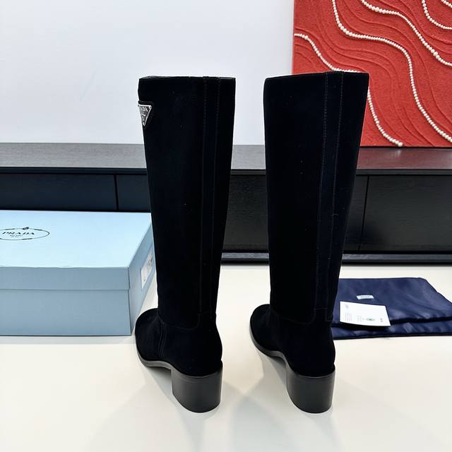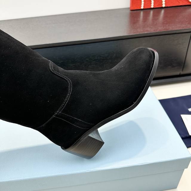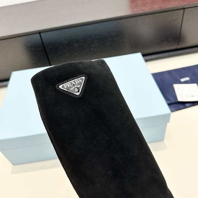 这款及膝长靴甄选丝滑绒面皮革制成,造型经典隽永。涂珐琅三角形金属徽标彰显经典优雅格调.