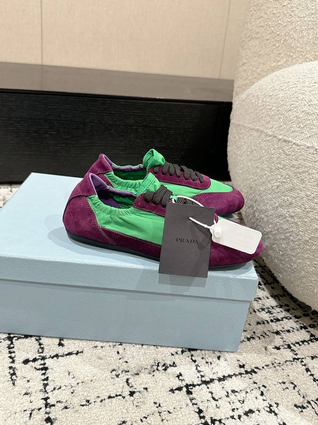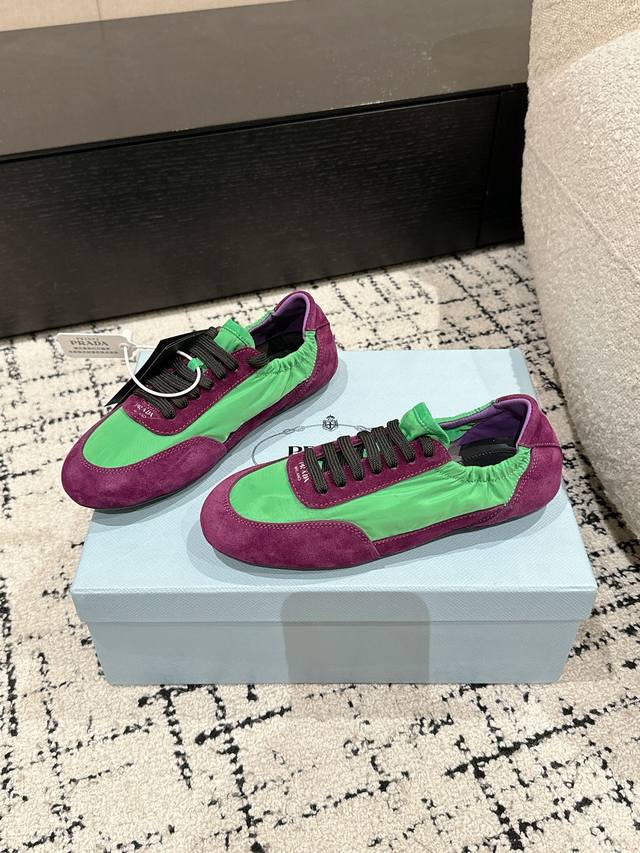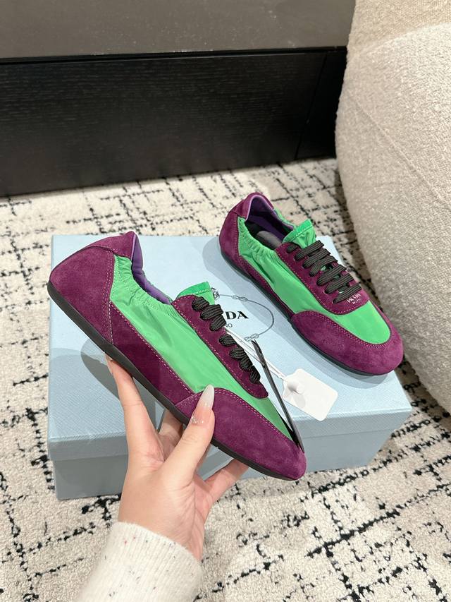 出镜率很高的就是这款德训鞋 外形是像芭蕾舞鞋一样的跑鞋,柔软的皮质加上prada 专属尼龙材质上脚的轻盈度和舒适度是最抗打的!本来就是复古感拉满的单品,既可以搭配新颖时髦的单品,也可以搭配整体做旧的复古感造型,都可以完美驾驭